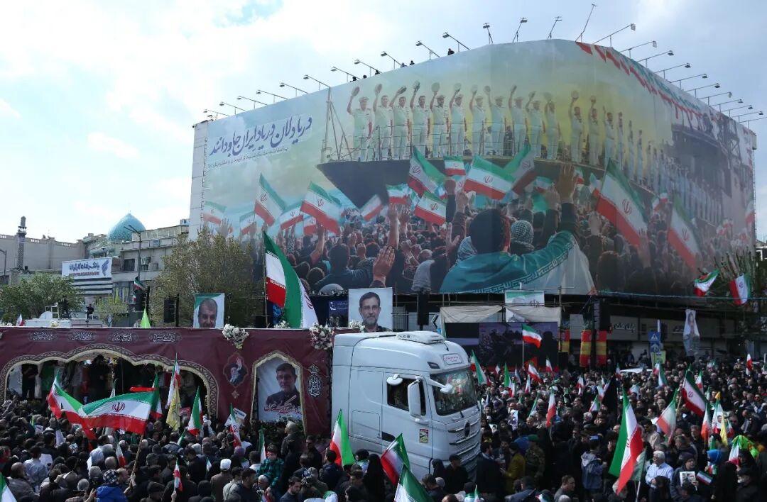 4月1日,在伊朗首都德黑兰革命广场,民众参加为伊朗伊斯兰革命卫队海军司令坦格西里、伊朗武装部队总参谋长顾问贾姆希德·埃哈基及伊朗武装部队军事人员举行的告别仪式。新华社记者 沙达提 摄