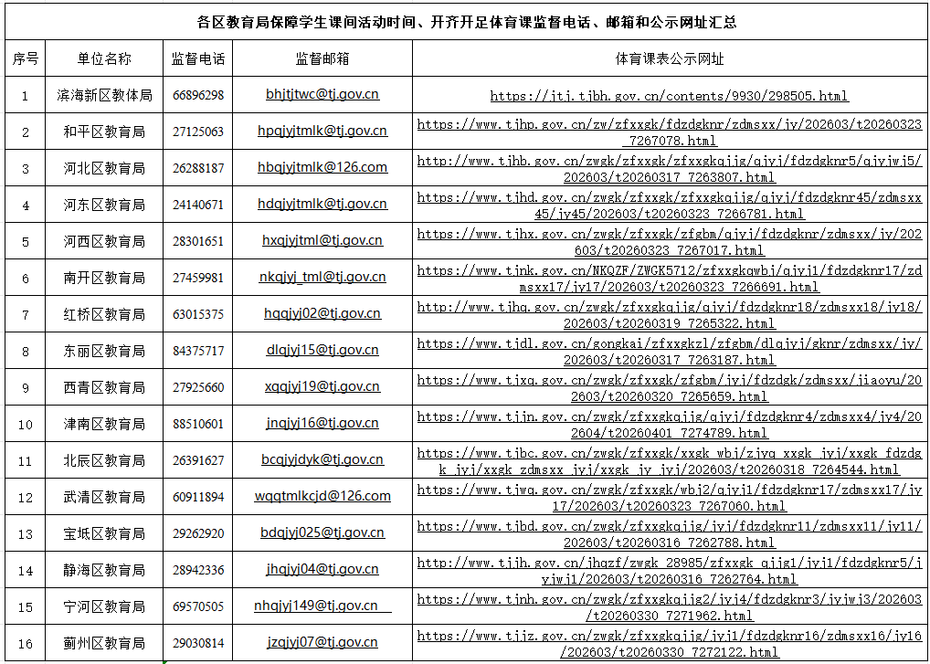 为进一步畅通监督渠道,广泛发挥师生家长和社会公众监督作用,保障中小学生每天综合体育活动时间不低于2小时,市教委公布了各区教育局2026年保障学生课间活动时间、开齐开足体育课的监督电话、邮箱和体育课“晒课表”网址。