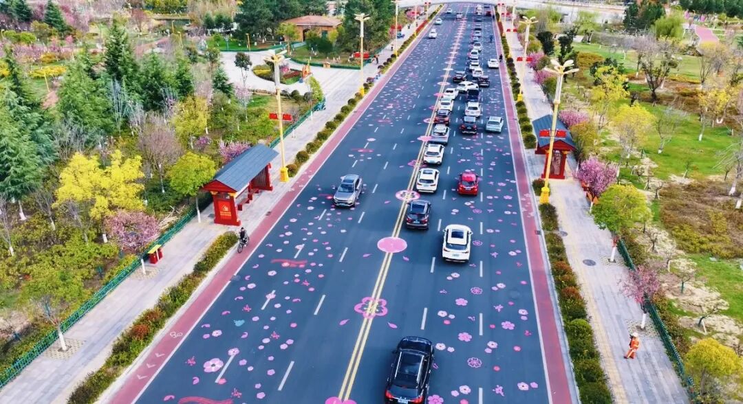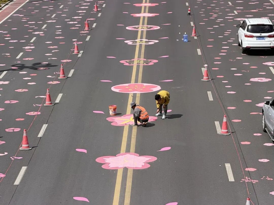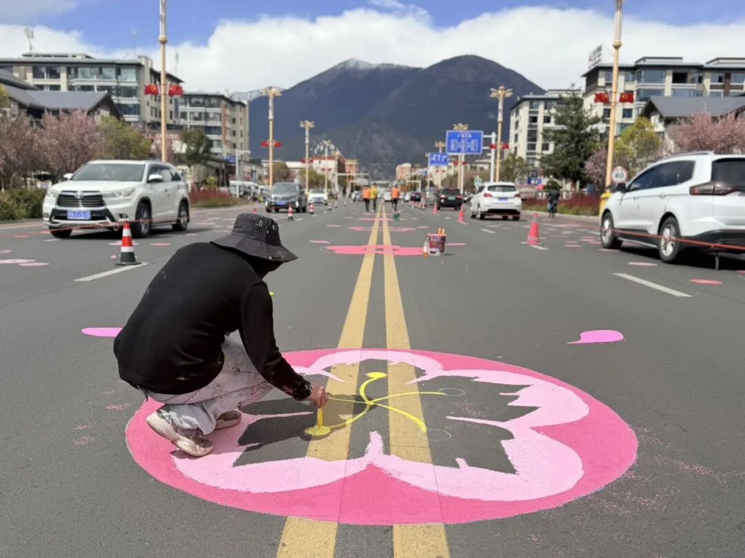 林芝在街边路面全画满桃花彩绘