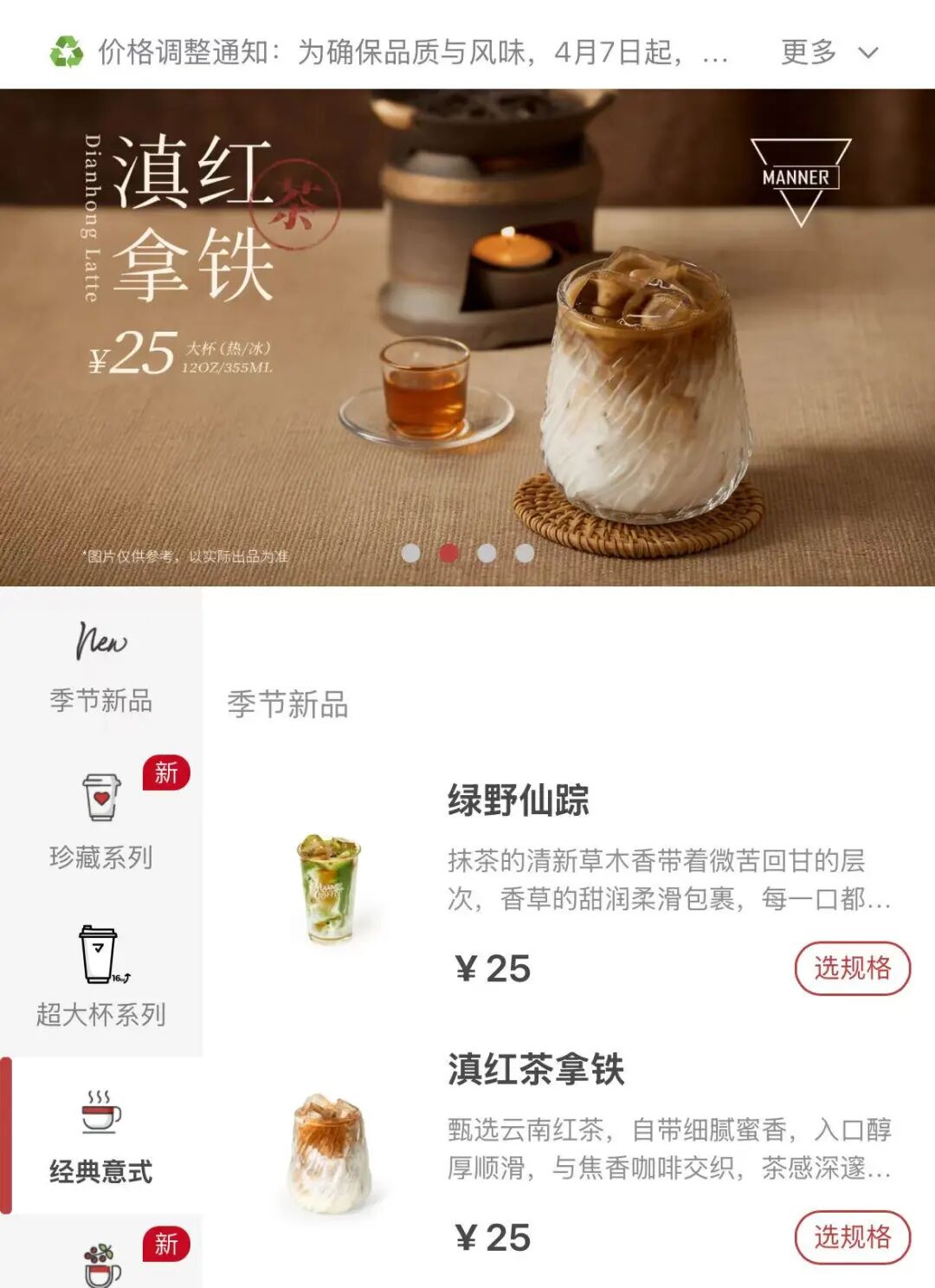 近期,Manner Coffee在其官方点单小程序发布价格调整公告,表示从4月7日起将门店单品豆SOE咖啡,每杯价格上调5元。此外,其门店热门产品“绿野仙踪”已在4月2日完成焕新升级,价格同样上涨5元。