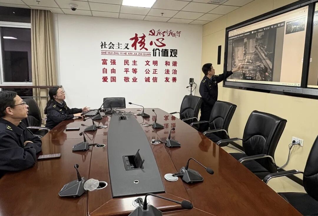 当晚,福州市生态环境保护综合执法支队主要领导在指挥室坐镇调度,依托无人机实时回传画面动态指挥执法。与以往依赖人工徒步、存在视野盲区的传统执法方式不同,本次行动联合专业无人机公司提前规划巡查路线,两台无人机同步升空、分线巡查,将高清画面实时传输至指挥室大屏。支队领导根据画面精准研判,直接调度地面执法组跟进核查,破解“看得见、够不着”的执法难题,让隐蔽违规施工无所遁形。