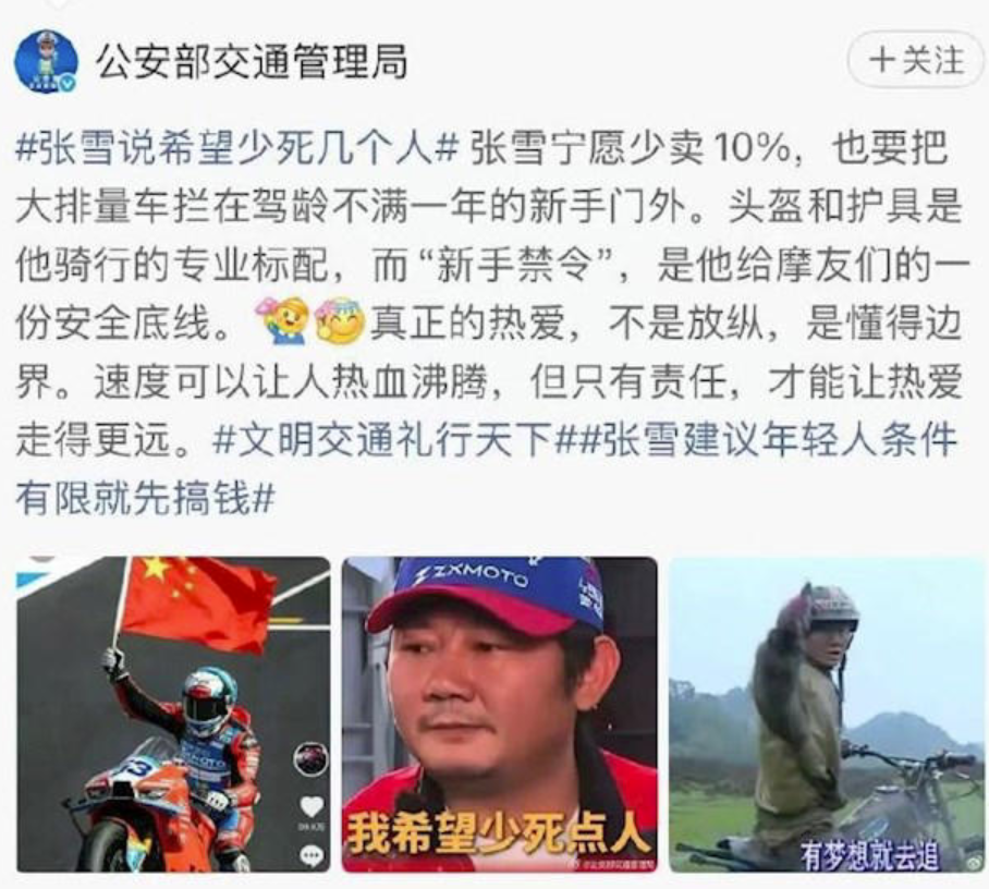 公安部官方微博4月1日回应,力挺张雪机车“新手禁令”,称这是给摩友们的一份安全底线。