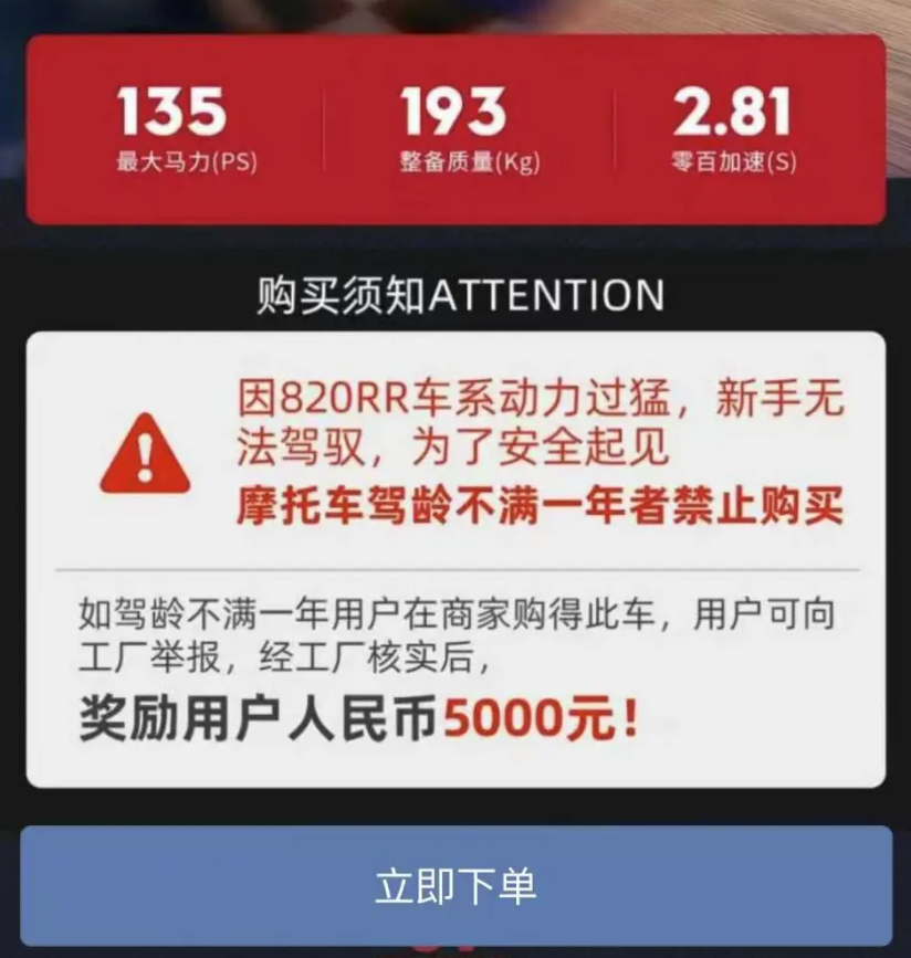 张雪机车仿赛车型820RR规定,摩托车驾龄不满一年者,禁止购买。(官方小程序截图)