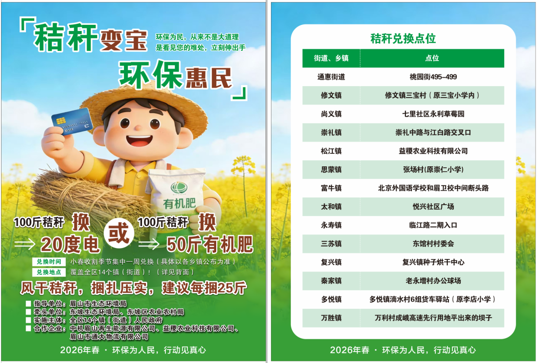 “秸秆不要烧,留着拉到服务点去,2斤秸秆能换1斤有机肥,100斤能换20度电!” 近日,这番话在眉山市东坡区农户间口口相传。一场别开生面的“秸秆置换”活动即将于小春收割季节在此启动。