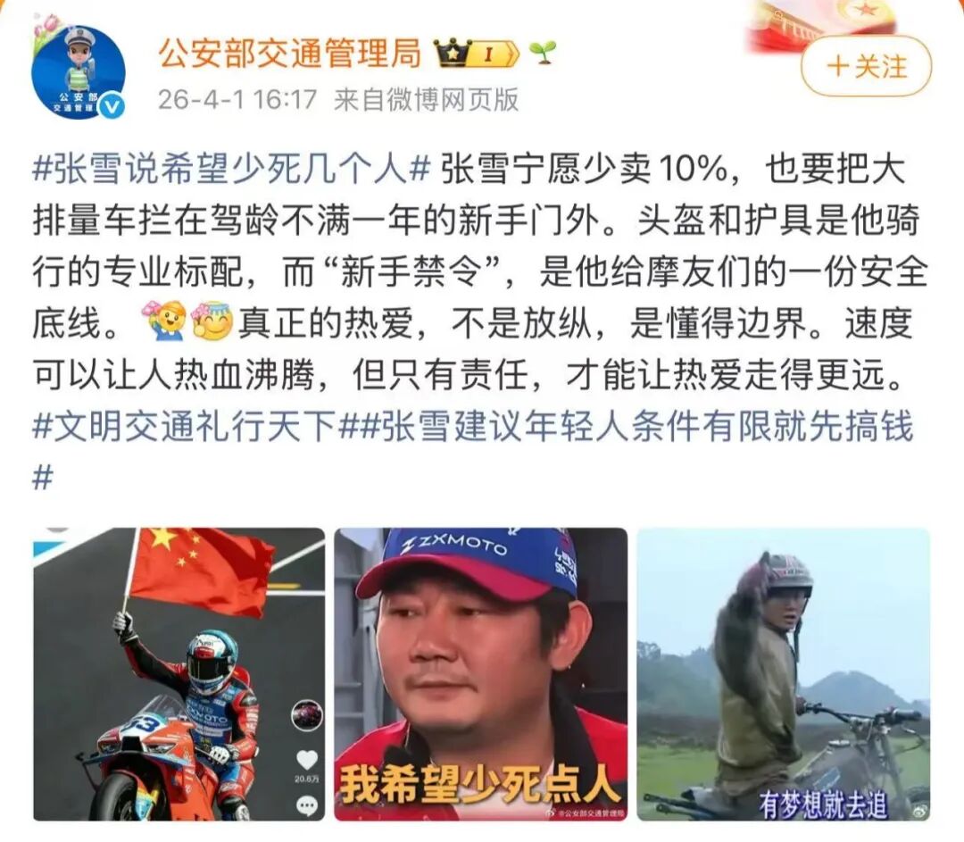 公安部交通管理局昨天(4月1日)发微博力挺张雪机车“新手禁令”称,这是给摩友们的一份安全底线。“真正的热爱,不是放纵,是懂得边界。速度可以让人热血沸腾,但只有责任,才能让热爱走得更远”。