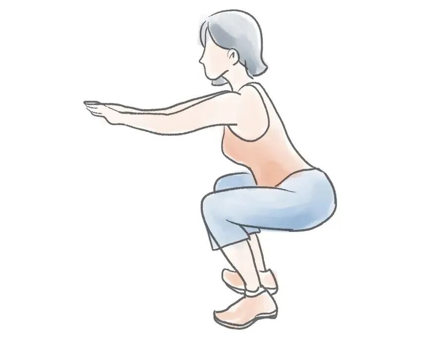 ✅️ 正确做法:双脚分开与肩同宽,上身保持挺直,膝盖弯曲,使身高降低10厘米左右,膝盖不超过脚尖。要注意,沉腰下蹲时,脚尖和膝盖都要向外张开,能减轻膝盖负担,避免运动损伤。