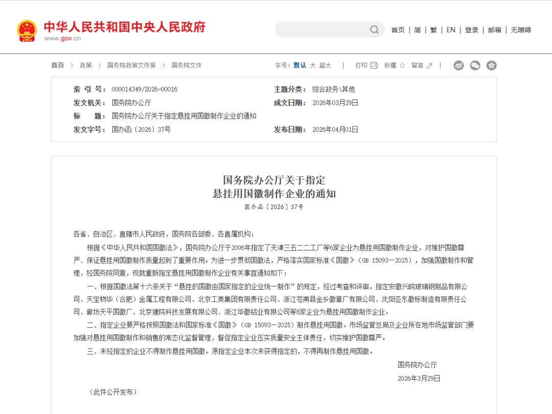 近日,国务院办公厅印发《关于指定悬挂用国徽制作企业的通知》(国办函〔2026〕37号),重新指定悬挂用国徽制作企业。通知内容如下: