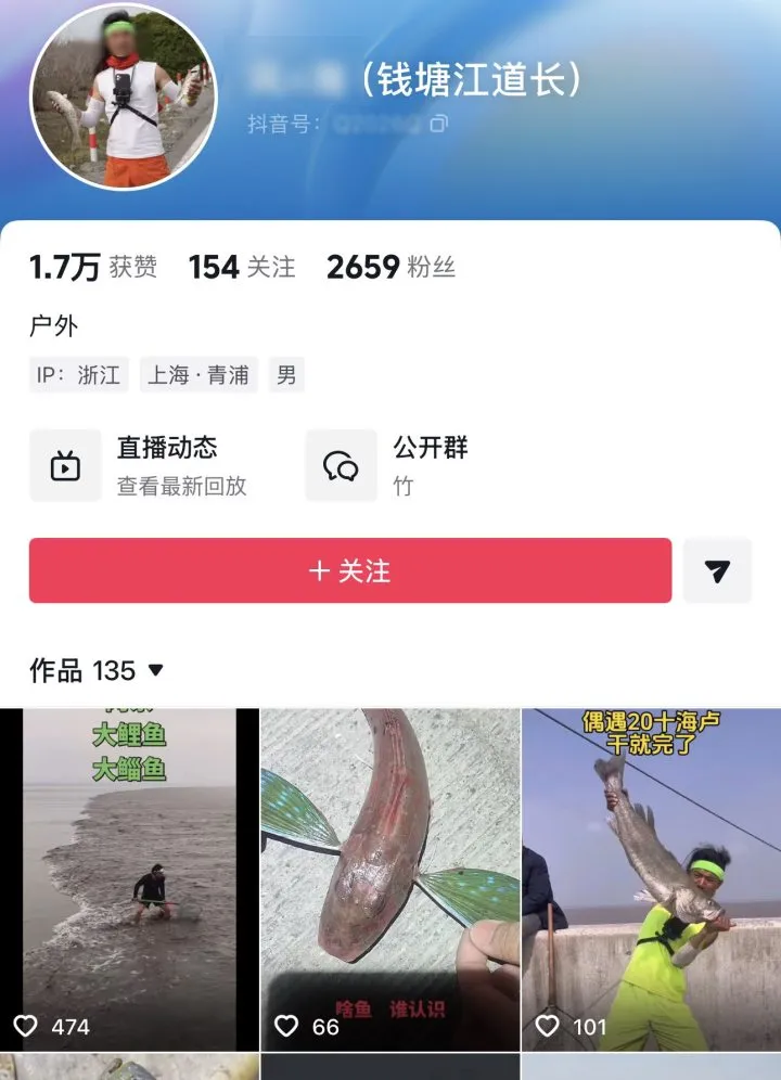 记者注意到,“钱塘江道长”的社交账号,有2719个粉丝,总共1.8万点赞。主页视频,大多数是他在钱塘江里扛着大网兜追逐潮头鱼。