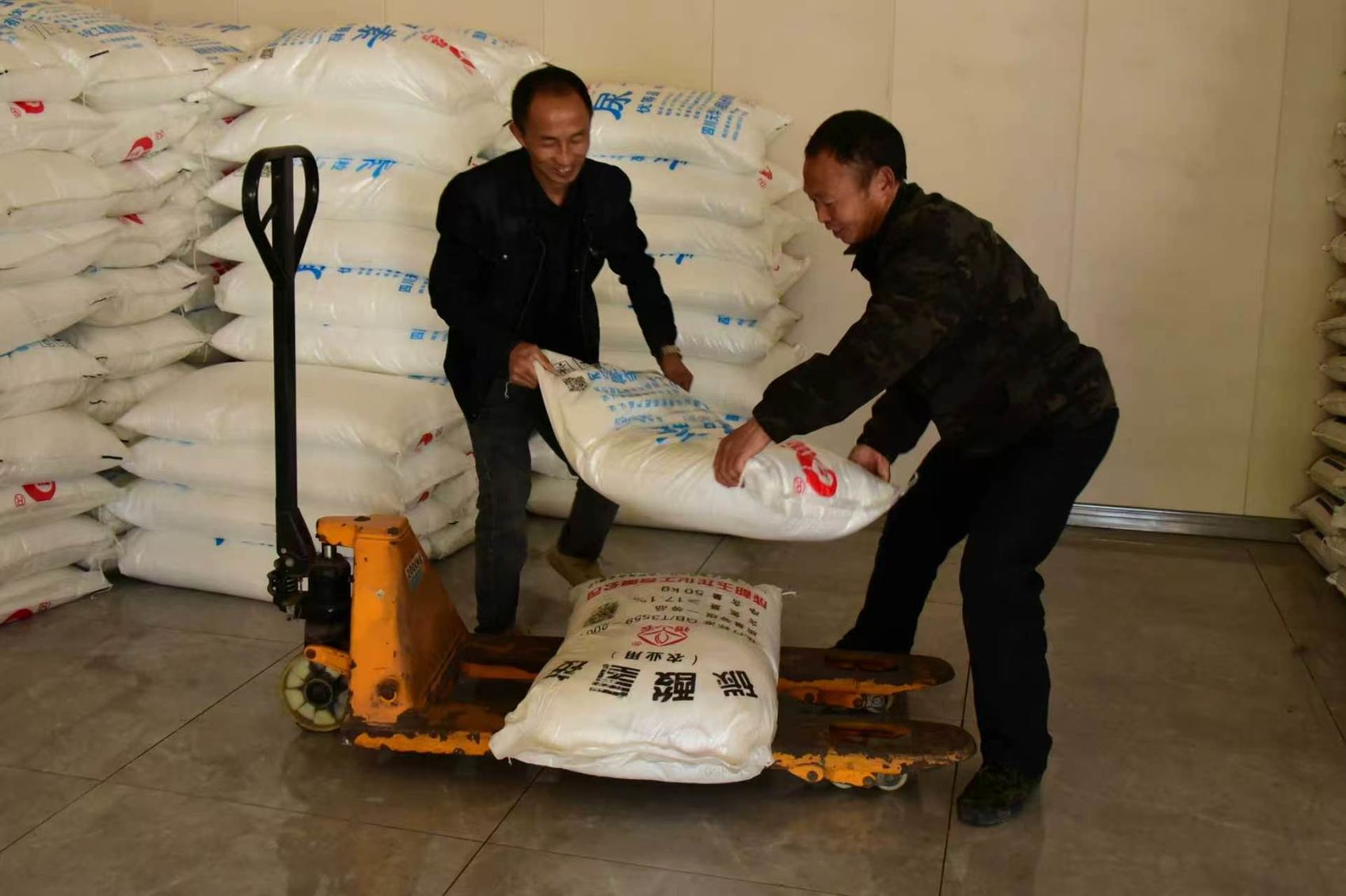交谈中,一位农民前来购买一袋50公斤装碳酸氢铵准备秧苗追肥。赖德勇与他简短交流价格等情况后,径直走向化肥专区,选上一袋白色包装碳酸氢铵,合力抬起来放进一辆三轮电动车的车厢里。