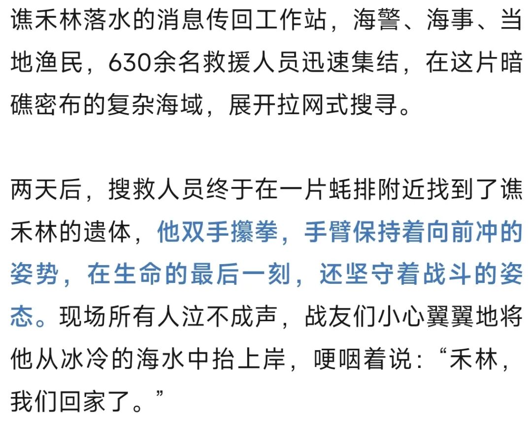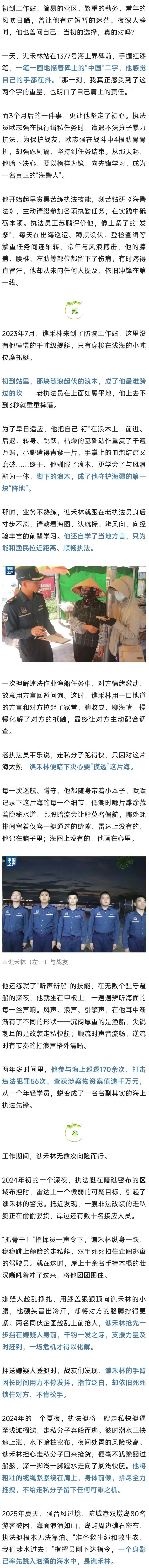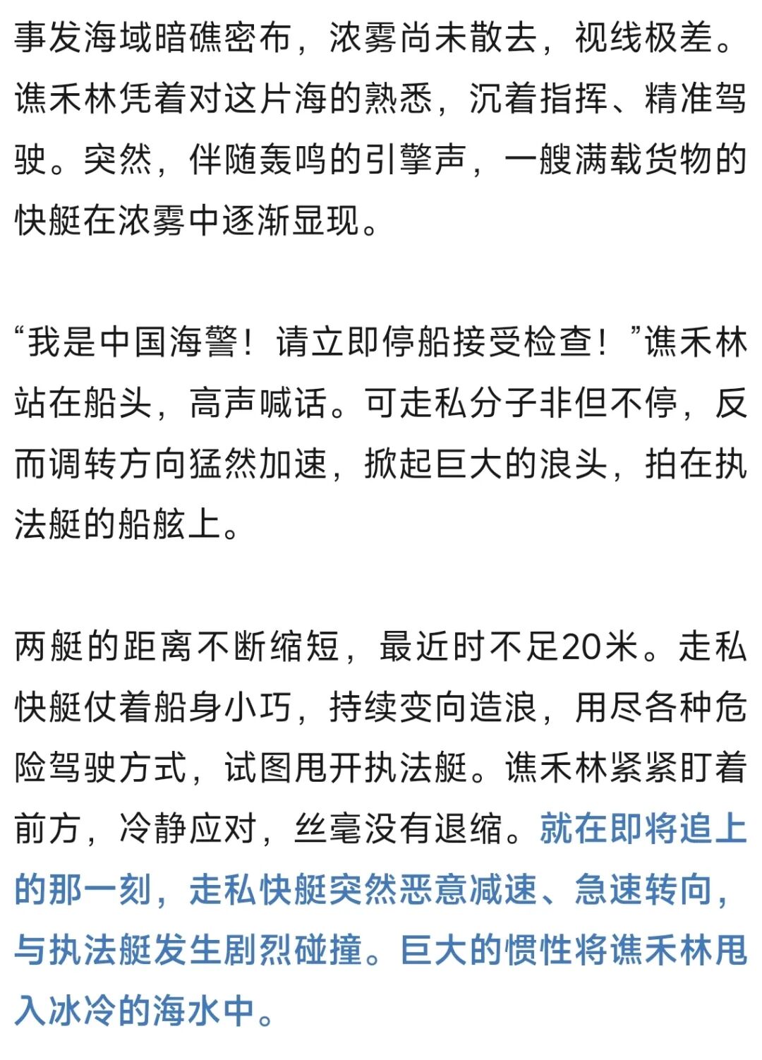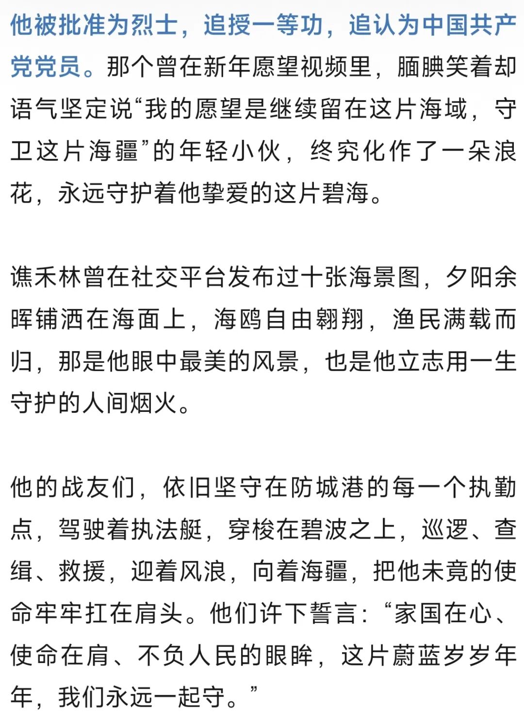 2025年12月9日,广西防城港海警局防城工作站执法员谯禾林在查缉走私嫌疑船时遭遇暴力抗法,与恶意急转的走私艇高速冲撞,受伤落水后壮烈牺牲,年仅25岁。(此前报道:年仅25岁!广西海警谯禾林牺牲前最后画面公开,被走私艇高速冲撞……)