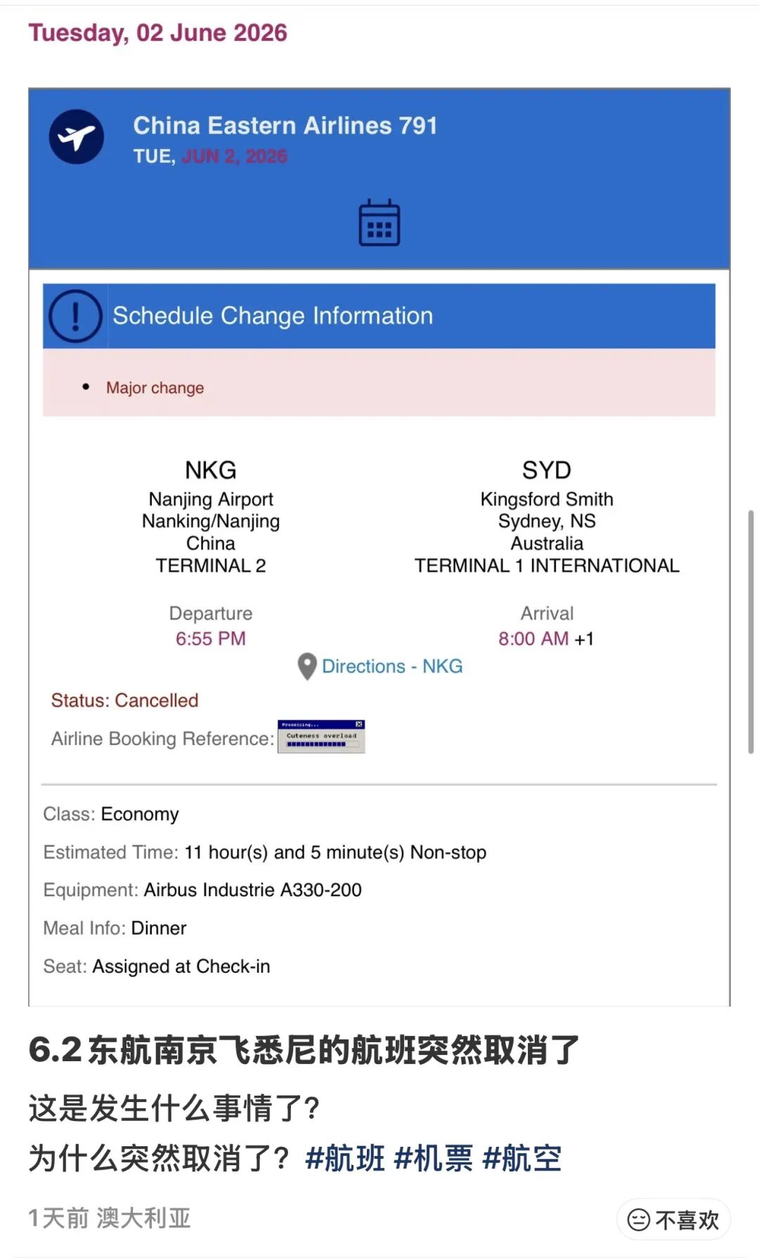 “6.8墨尔本飞南京的票没了,东航直接砍了整条线吗?”