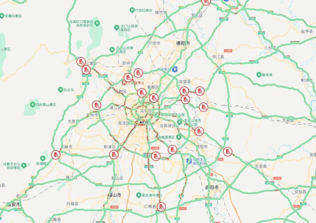 G4203成都第二绕城高速(SA2)、G4217成都经济区环线高速(SA3):与成都周边各主线高速的互通枢纽(如青白江、都江堰、崇州、新津、简阳、金堂等枢纽)车流交汇密集,普遍出现缓慢排行。