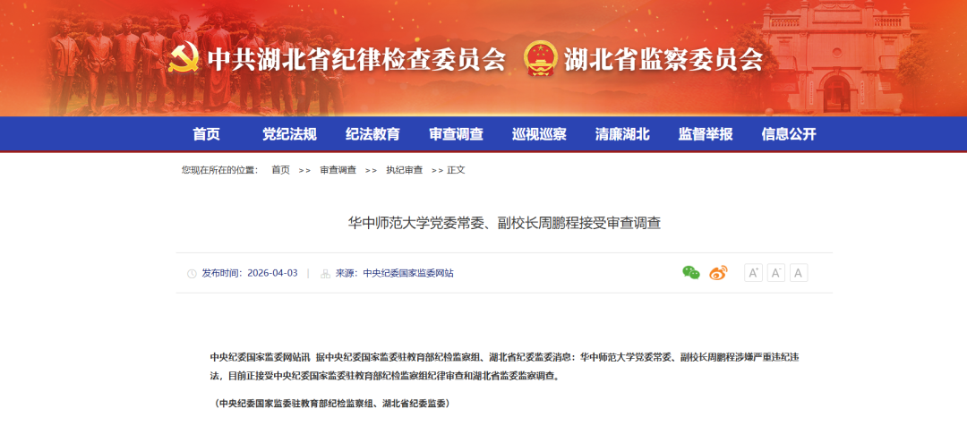 据中央纪委国家监委驻教育部纪检监察组、湖北省纪委监委消息:华中师范大学党委常委、副校长周鹏程涉嫌严重违纪违法,目前正接受中央纪委国家监委驻教育部纪检监察组纪律审查和湖北省监委监察调查。