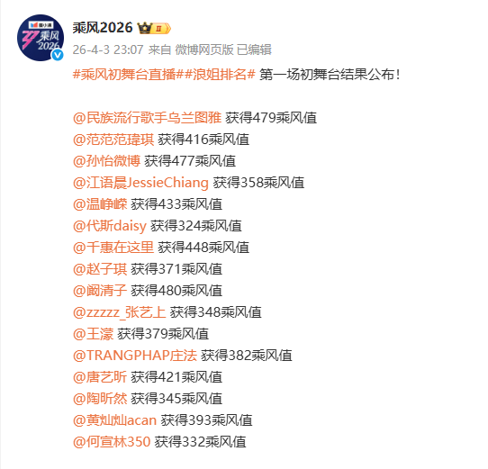 4月3日晚,备受期待的《乘风2026》初舞台直播正式开启,7组姐姐两两对决的PK赛制,让舞台全程高能不断,最终的票数结果也正式出炉,引发全网热议。