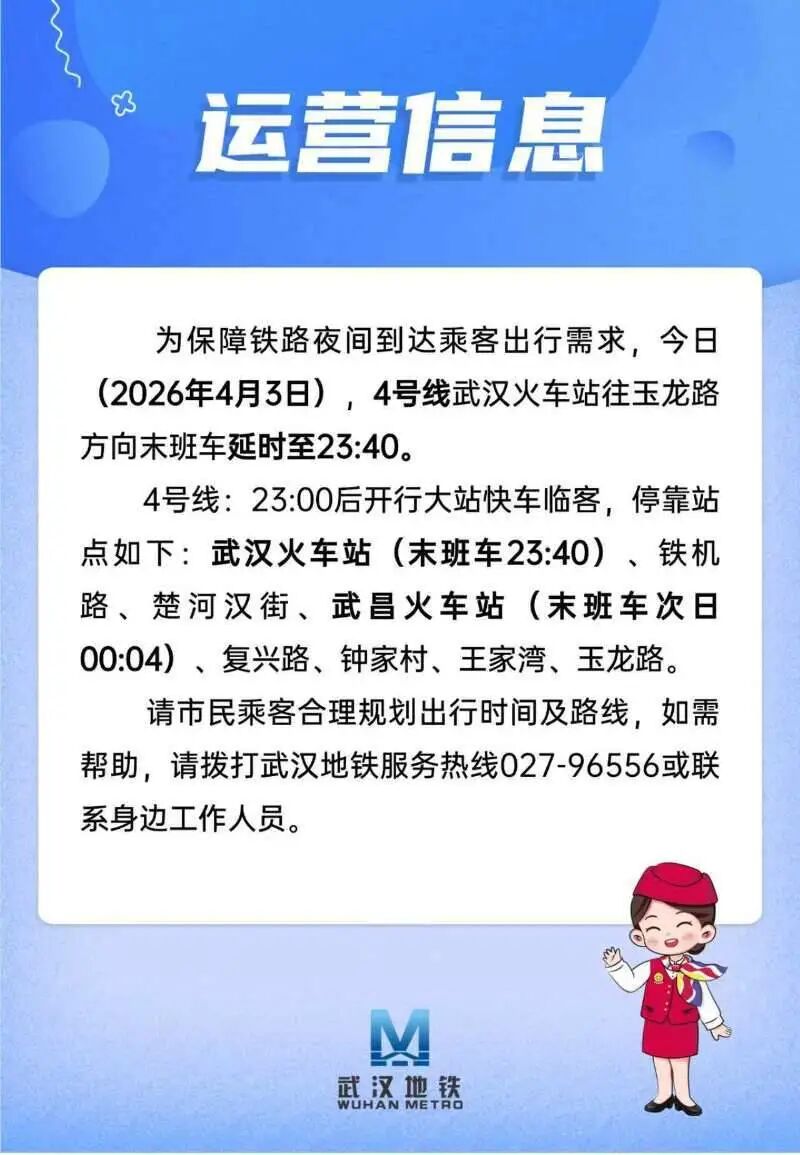 为保障铁路夜间到达乘客出行需求,今日(2026年4月3日),4号线武汉火车站往玉龙路方向末班车延时至23:40。