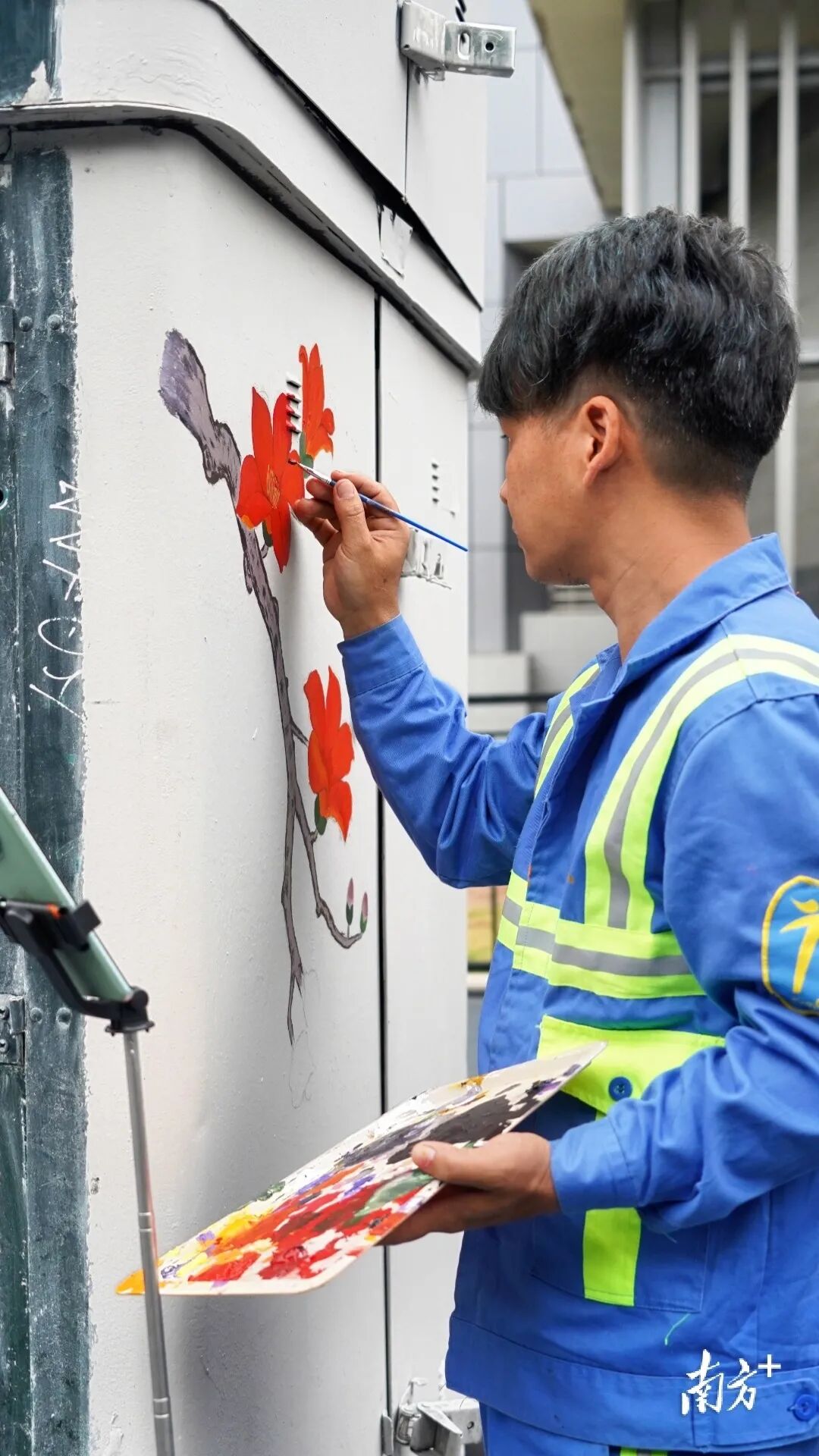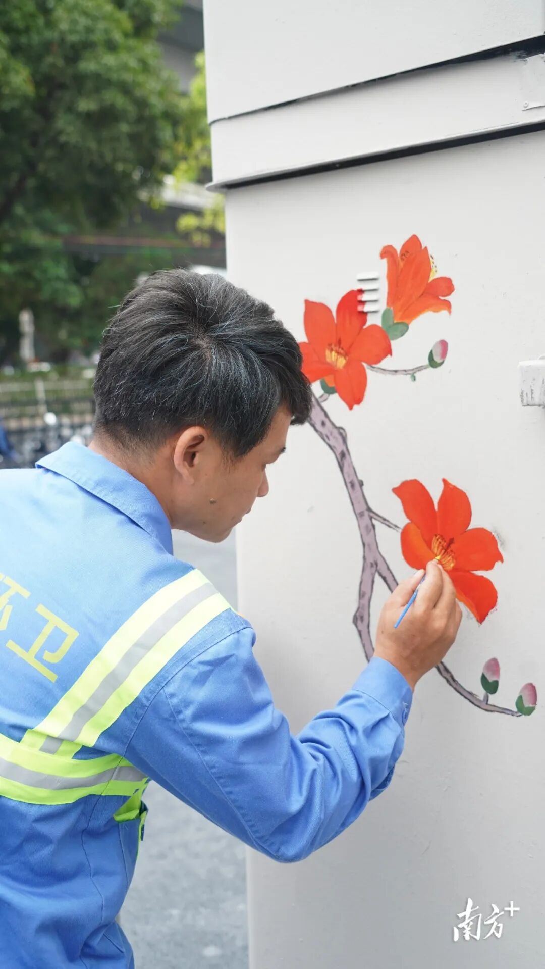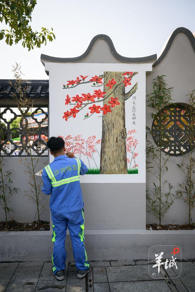 粗壮的树干、鲜艳的木棉,“顶天立地英雄花”是骆仕岳首幅作品。他先用铅笔在墙上画粗稿,接着用红色、黄的、黑的颜料一点点上色,“特别需要耐心。”