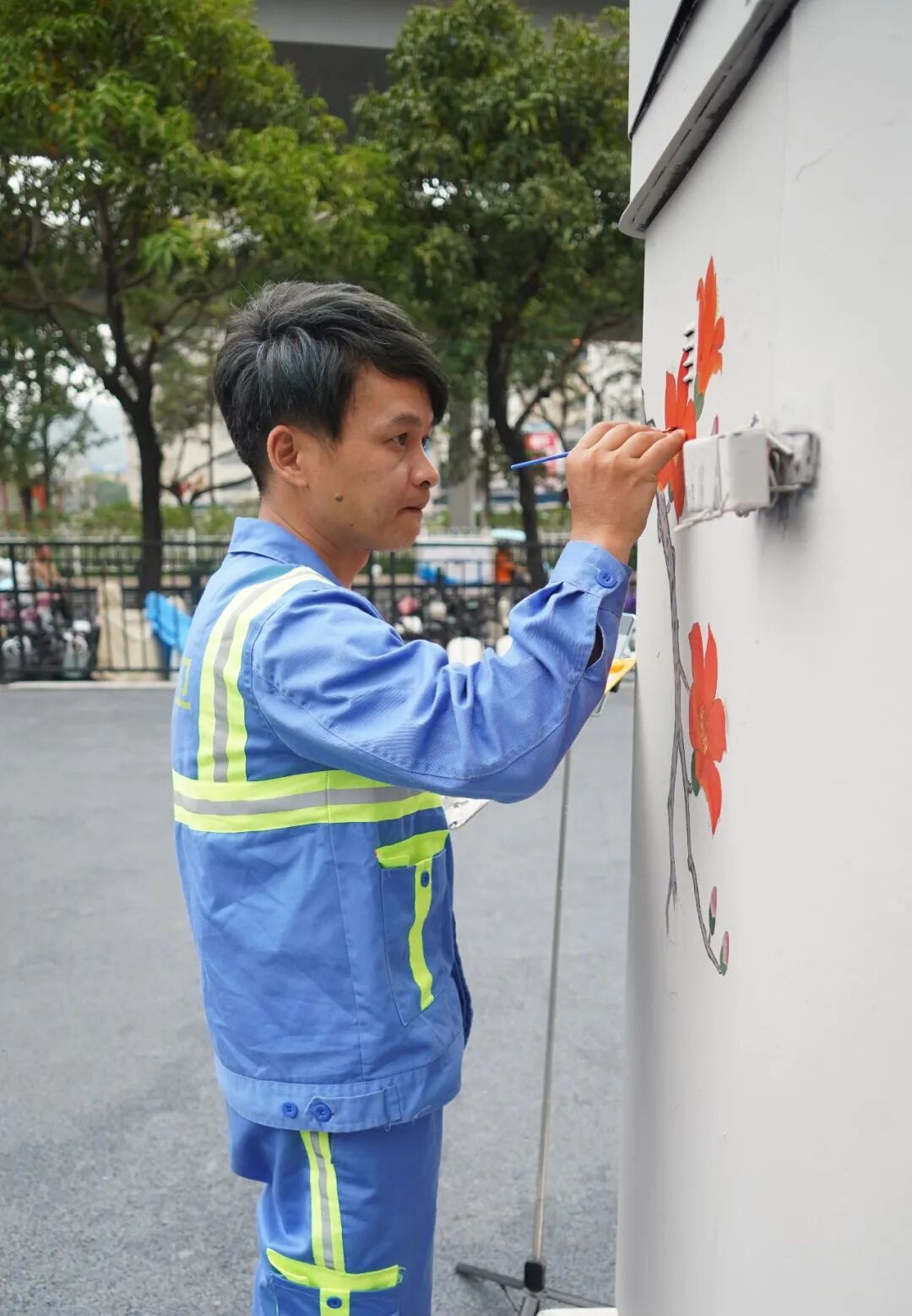 一名身穿环卫工服的人在街头画画
