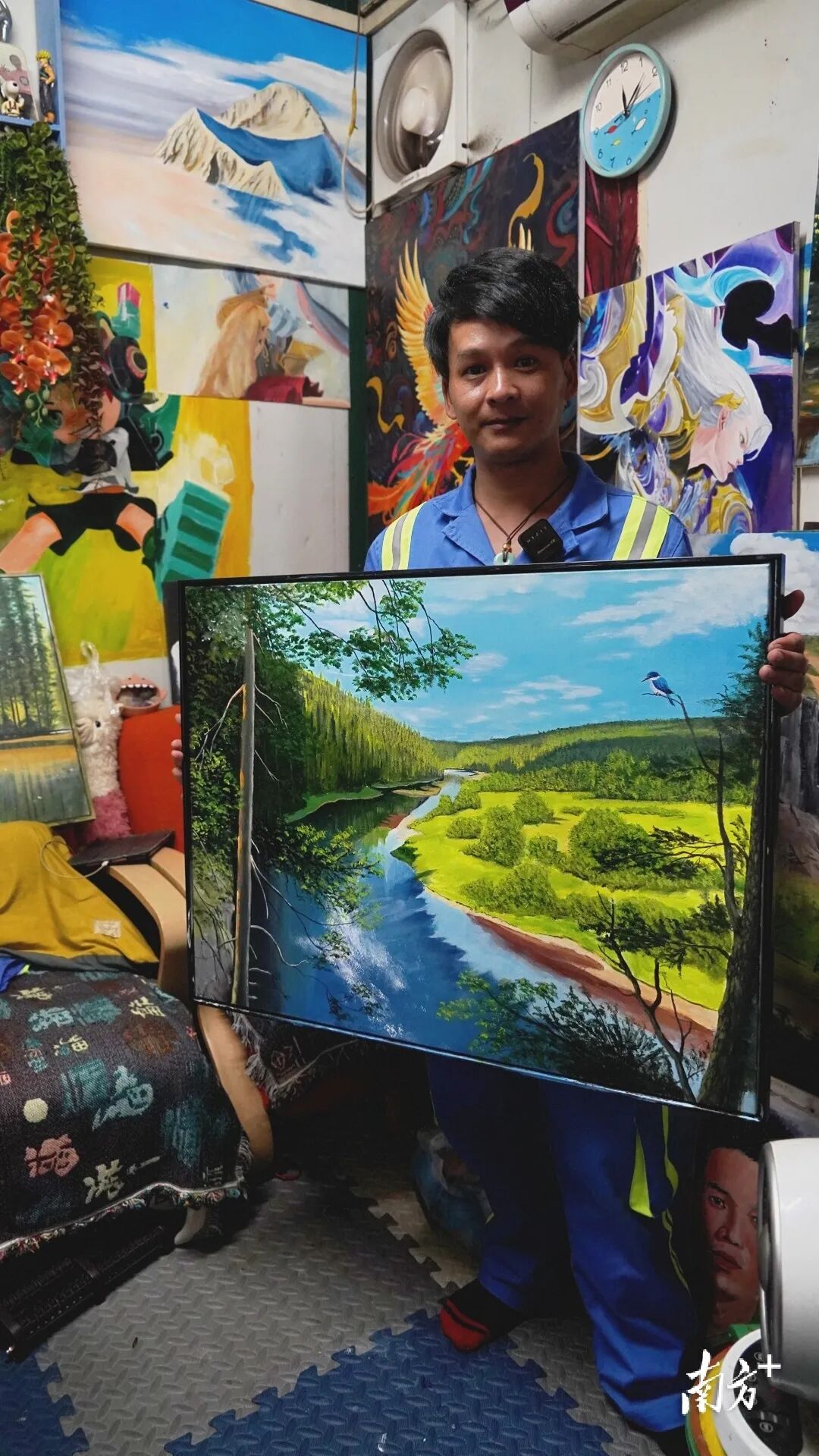 画画是骆仕岳自学的,他平时会照着网上喜欢的画家作品临摹,还会把画里原本的鹰,换成翠鸟。他说,小时候在河源老家的山里经常见到,他画的也是他的森林。