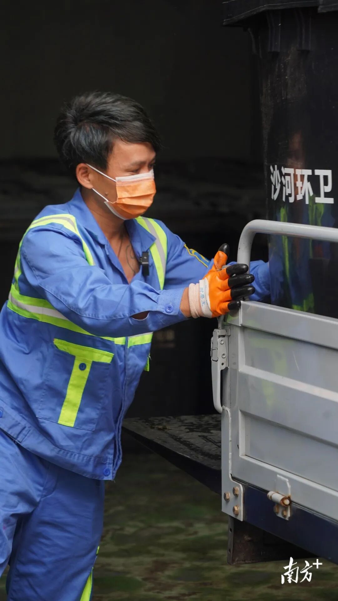 帖子里的主人公名叫骆仕岳,时年42岁,是广东河源人,2014年开始在广州天河区沙河街道做垃圾装卸工。他介绍称,自己干这行12年了,现在他每天和半人高的垃圾桶打交道,这是他的生计。