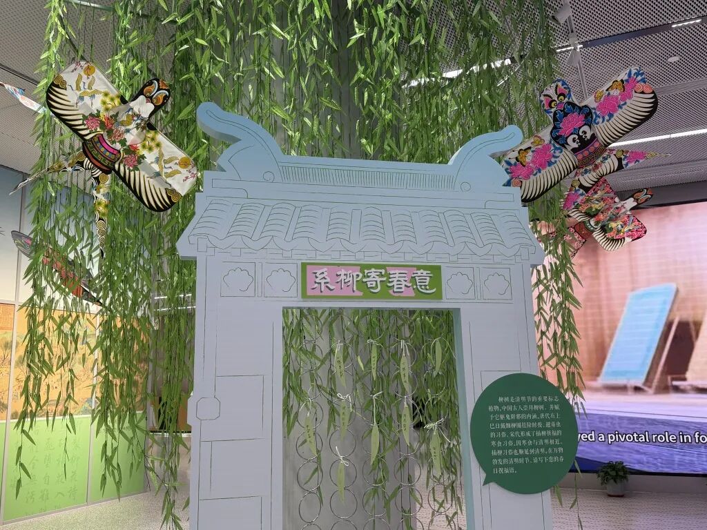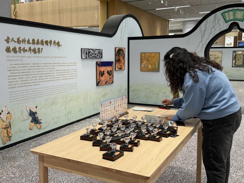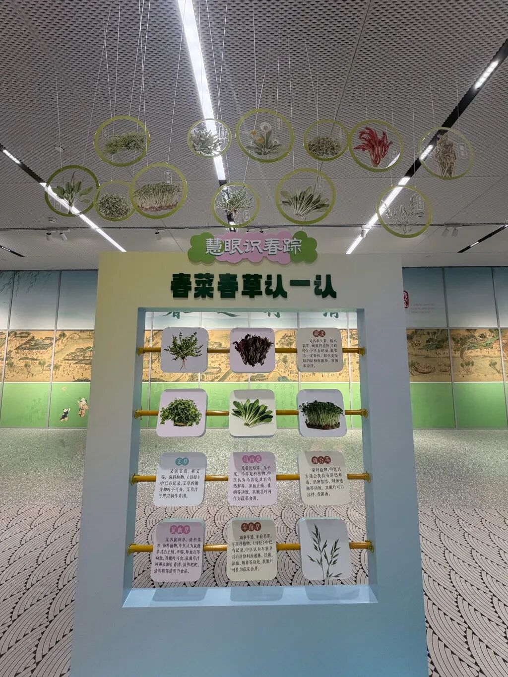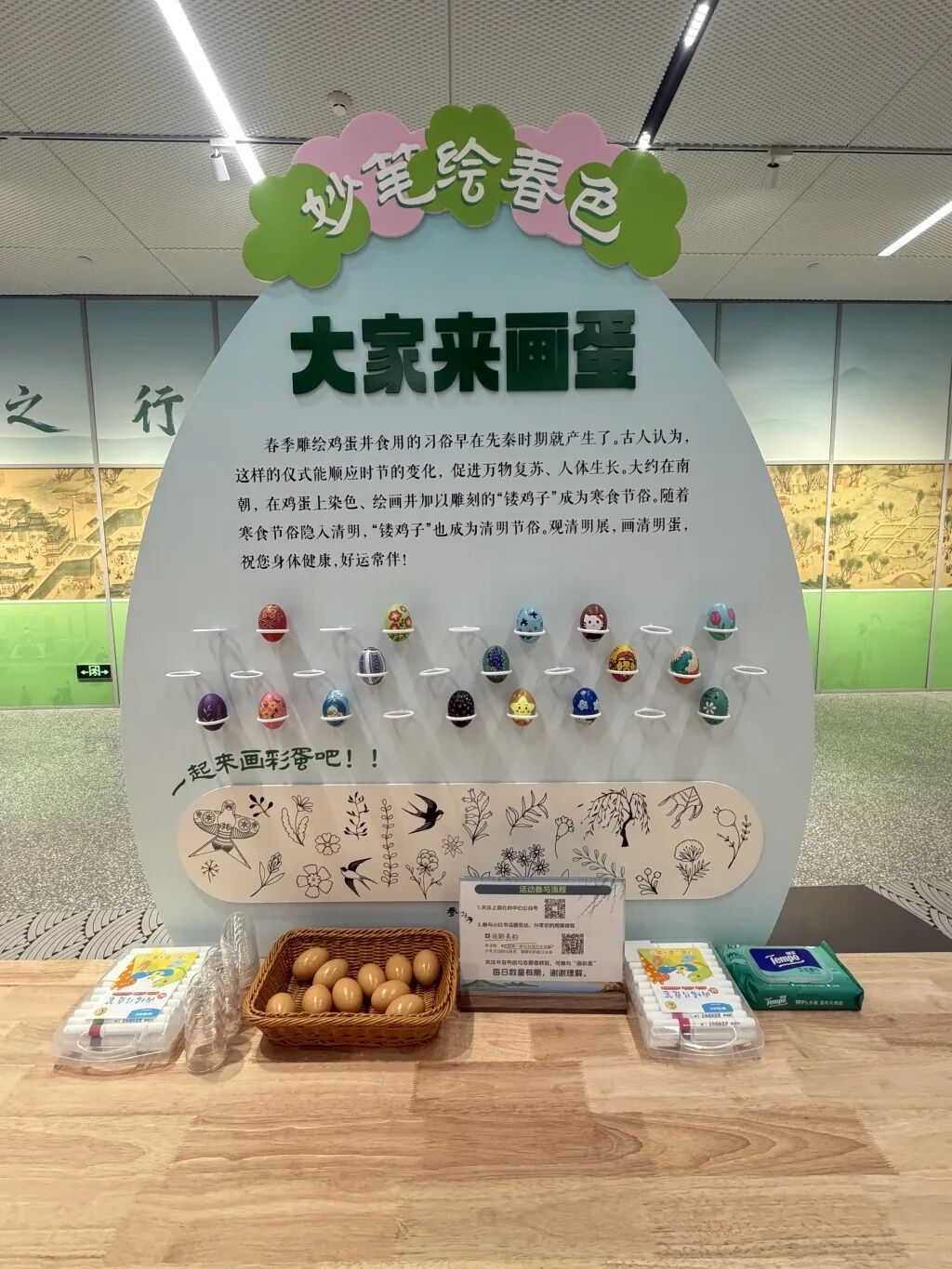 展区外,三个趣味互动项目更是让市民沉浸式感受清明乐趣,贴合展览“清明游戏场景”的核心主题。清明画蛋体验复刻古人“镂鸡子”的习俗,邀请市民亲手在鸡蛋上染色、刻画,重温孩童时期的节日乐趣,感受清明时节顺应节气的养生智慧;“春菜春草认一认”通过实物展示和文字介绍,向市民普及清明常见的野菜种类,让大家了解清明食春菜的传统习俗与养生价值;“系柳寄春意”板块准备了绿色纸裁剪的柳叶,邀请市民写下春日祝福,系在门框上,既呼应了清明插柳的习俗,也让大家在互动中寄托对春日的美好期许。