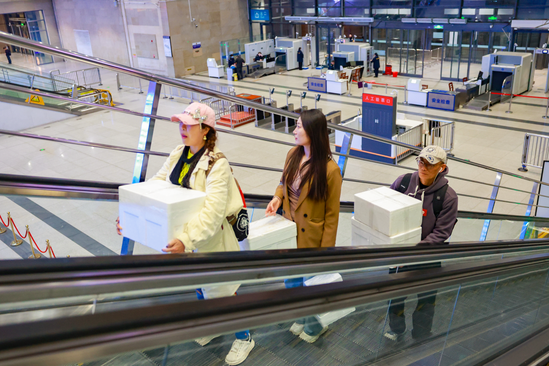 “满城草莓味道确实香甜,就是太娇嫩、怕压。这种泡沫箱既能保温又能减震,带上火车一点都不用担心损坏,拎着还轻便。”旅客刘先生拿着手中的“小白箱”,笑着说道。