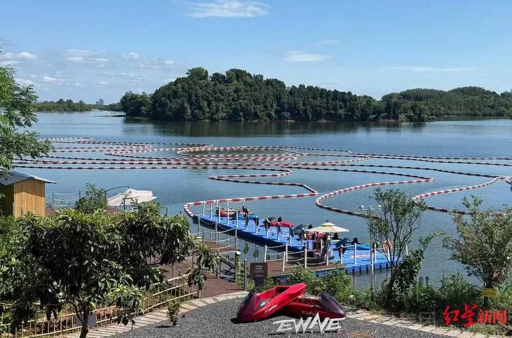 熊猫索道滑水公园位于三岔湖马鞍山码头旁,是2025年成都世运会索道滑水项目的比赛场地,如今已正式向市民游客开放。公园整体水域面积超过200亩。