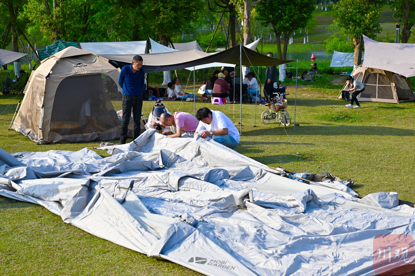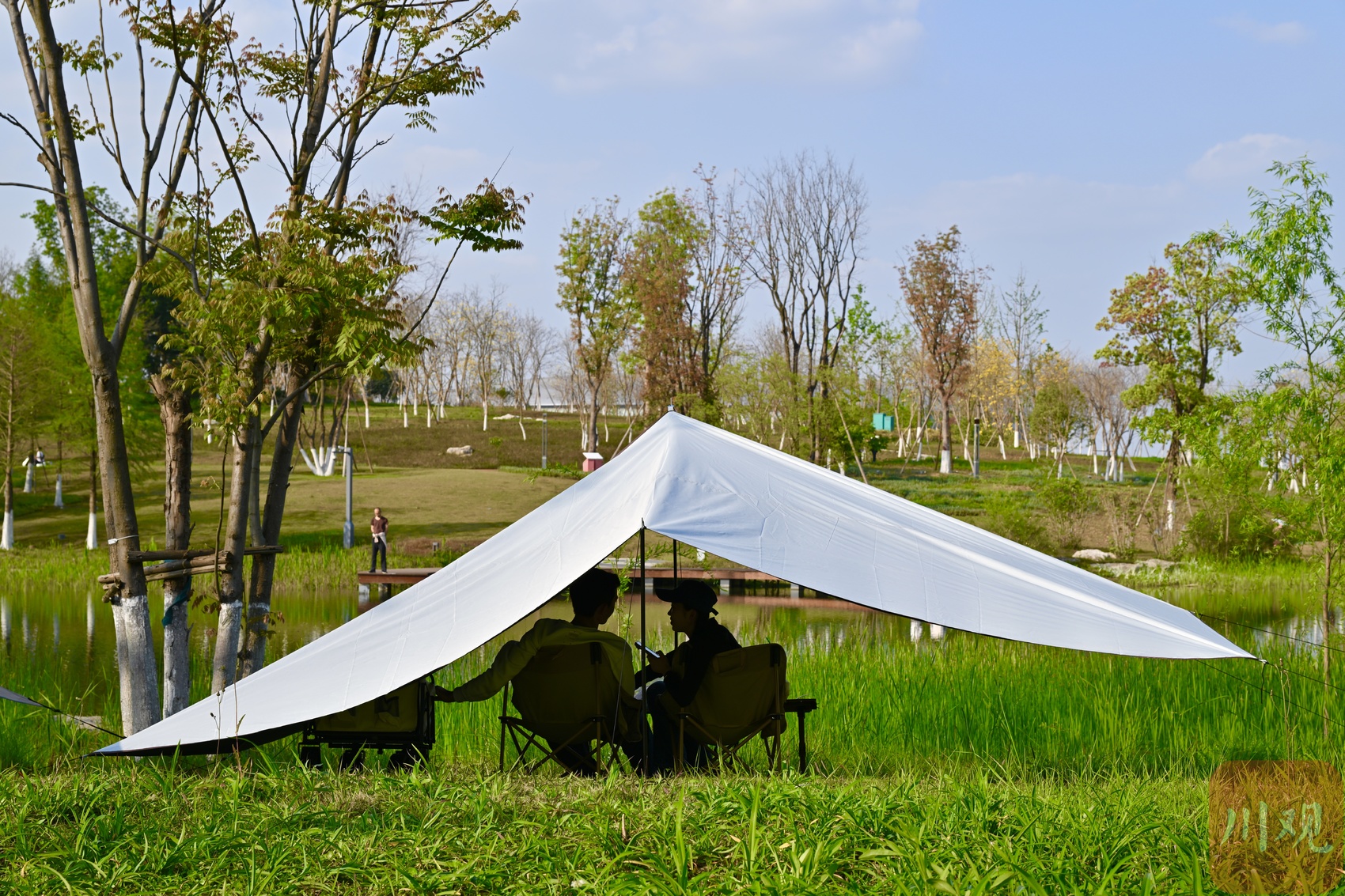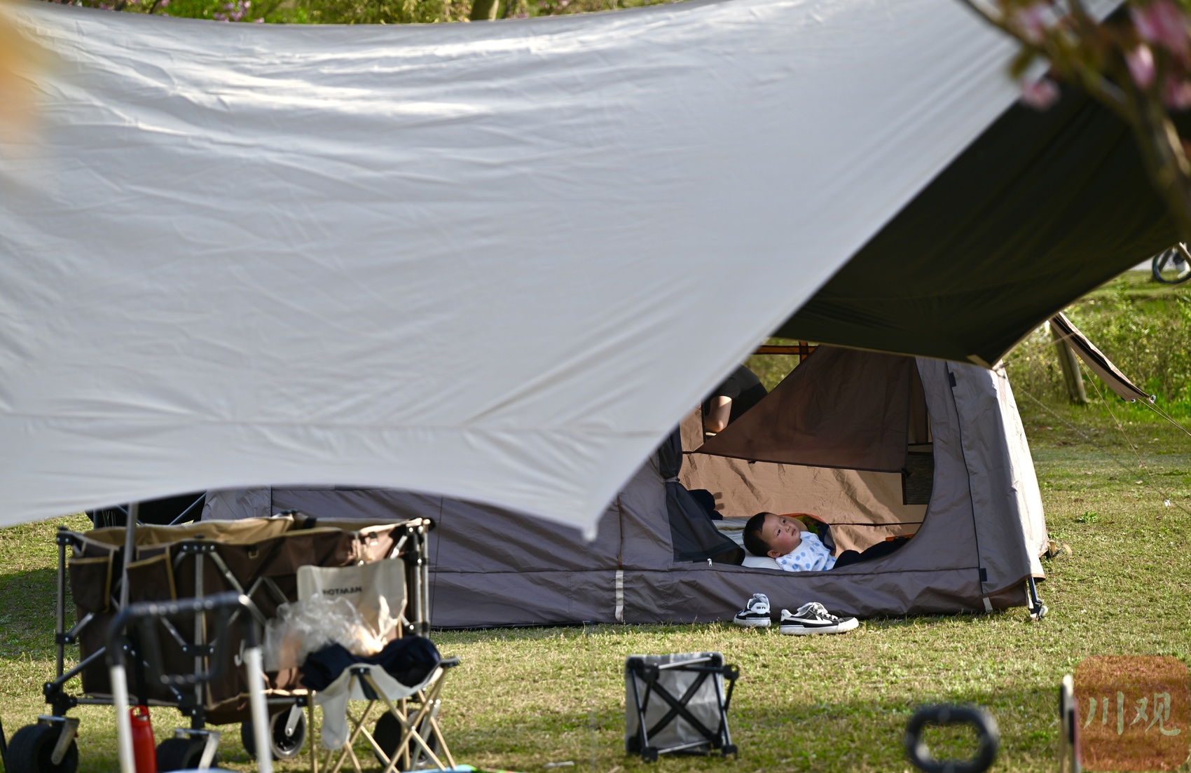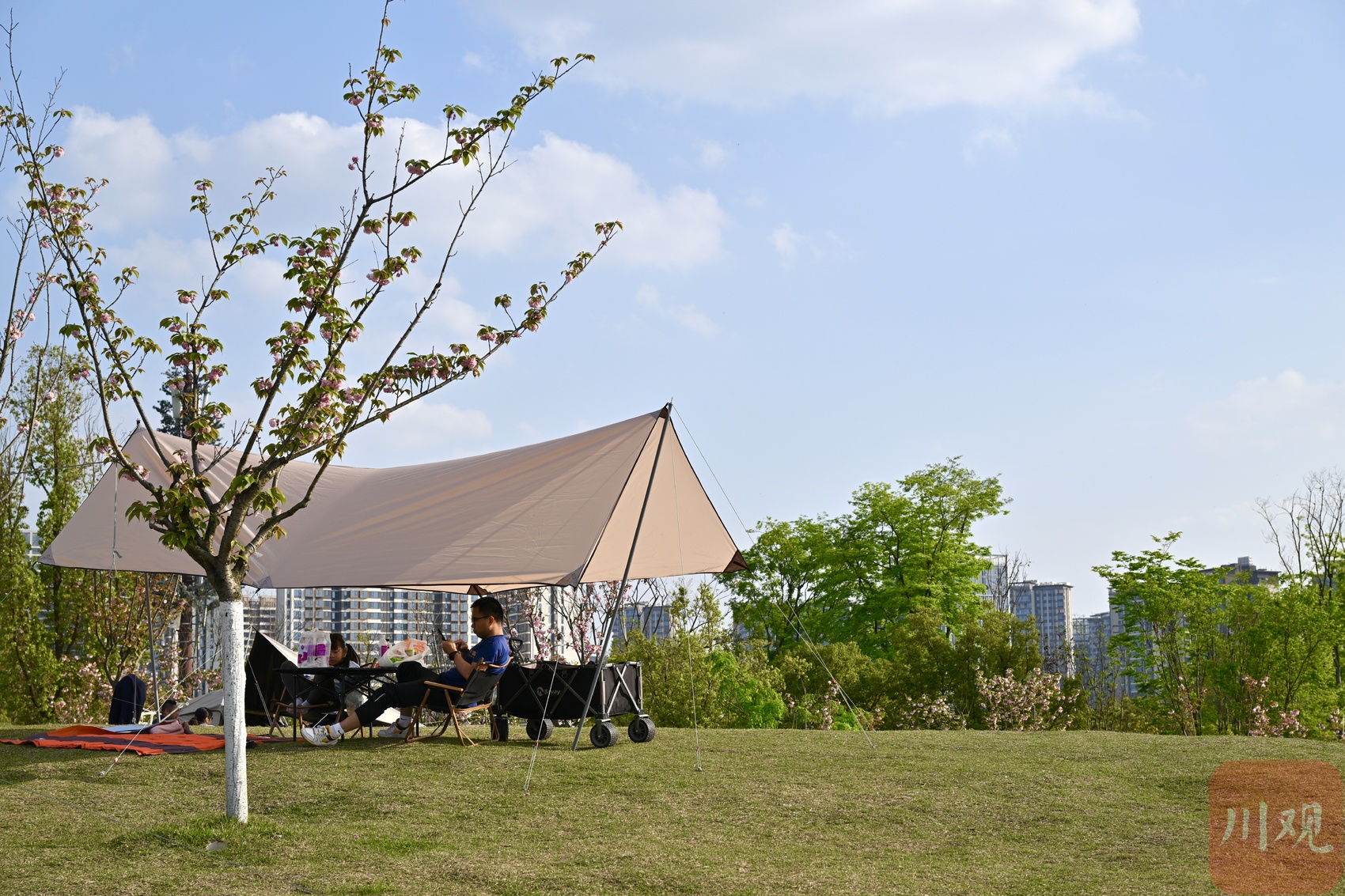 4月4日,清明节假期首日,成都市区天朗气清、春光正好。东安湖公园书香岛露营地人气旺盛,不少市民游客携家人前来露营踏青,尽享春日美好。