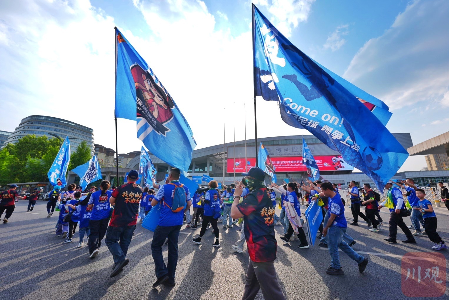 春光正好,比赛激烈,成都宜宾,强强对垒,球迷之间,气氛热烈,互换礼物,把手言欢,有情有义,享受赛事。