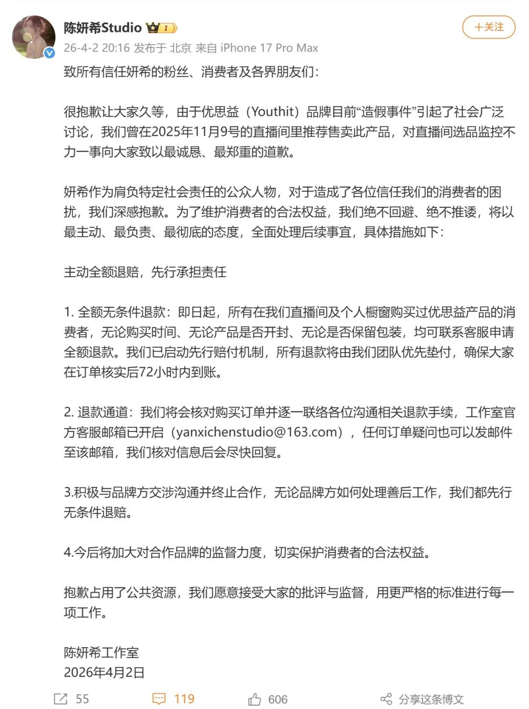 4月2日,陈妍希工作室也就此事发文致歉:主动全额退赔,先行承担责任。