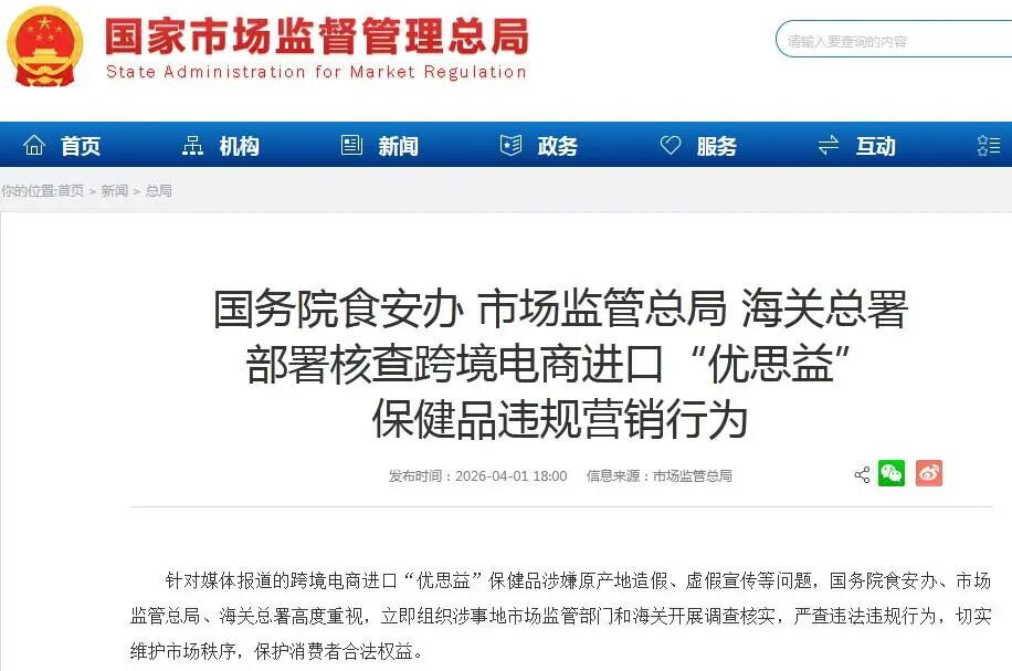 据国家市场监管总局网站4月1日消息,针对媒体报道的跨境电商进口“优思益”保健品涉嫌原产地造假、虚假宣传等问题,国务院食安办、市场监管总局、海关总署高度重视,立即组织涉事地市场监管部门和海关开展调查核实,严查违法违规行为,切实维护市场秩序,保护消费者合法权益。