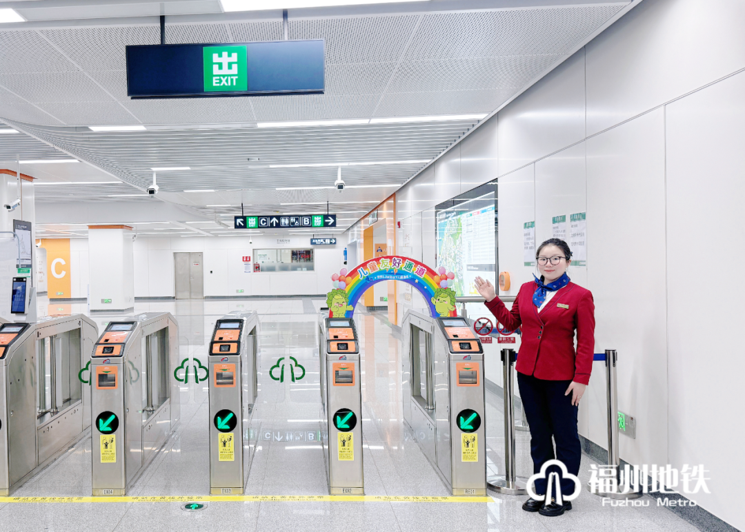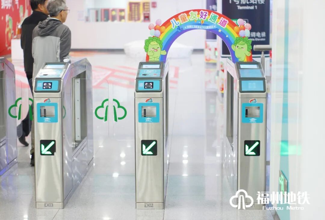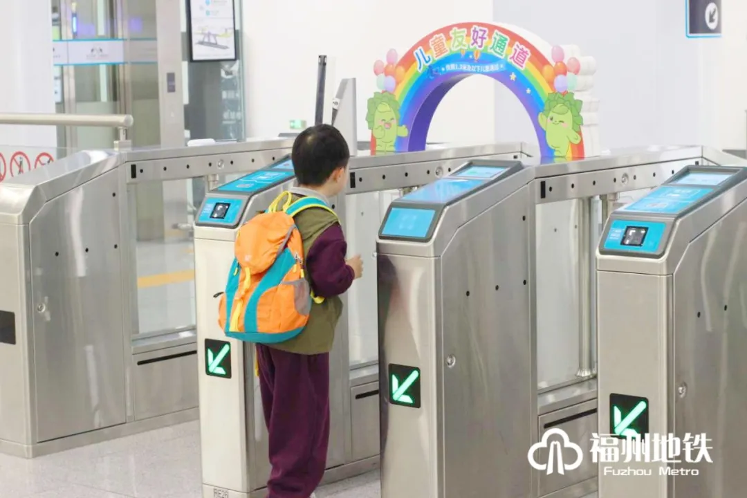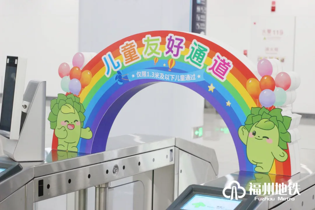福州地铁儿童友好通道采用彩虹拱形门+可爱卡通形象双重指引,醒目设计可使小朋友们快速找到专属通道,适用于身高1.3米及以下且未达到法定入学年龄的学龄前儿童出行使用。