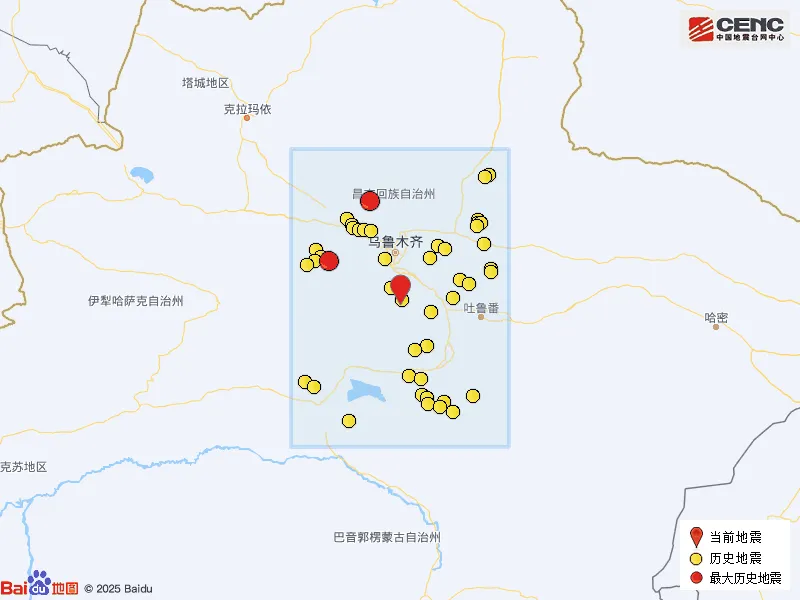 历史地震:根据中国地震台网速报目录,震中周边200公里内近5年来发生3级以上地震共75次,最大地震分别是2026年3月7日在新疆昌吉州呼图壁县发生的4.8级地震(距离本次震中117公里)和2022年7月20日在新疆昌吉州昌吉市发生的4.8级地震(距离本次震中146公里),按震级大小前50次历史地震分布如图。