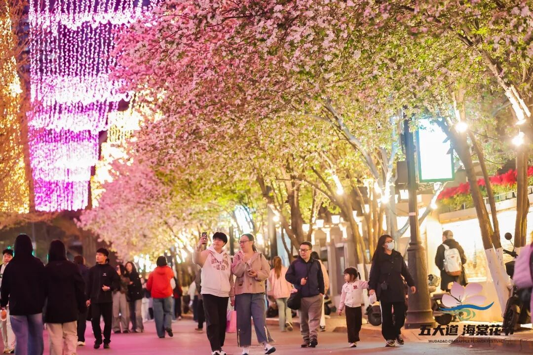 夜幕徐徐落下,民园广场又热闹了起来,每晚举行的点灯仪式开始了,朵朵海棠花在罗马柱上次第绽放,让民园广场瞬间成了花的海洋。主舞台上光影流转,歌舞、杂技等轮番上演,掌声与欢呼声此起彼伏,共同汇成了这座城市最深情的告白。