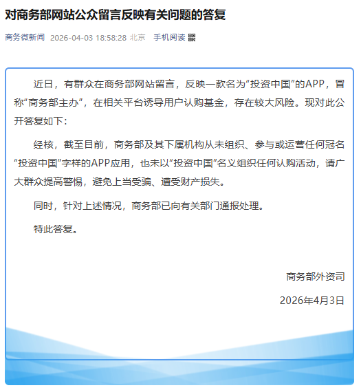 近日,有群众在商务部网站留言,反映一款名为“投资中国”的App,冒称“商务部主办”,在相关平台诱导用户认购基金,存在较大风险。现对此公开答复如下: