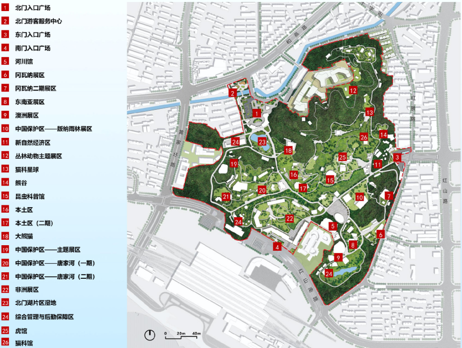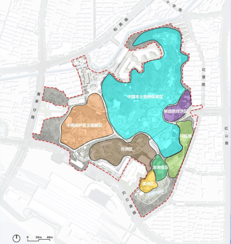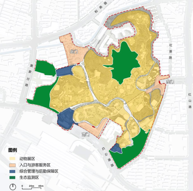 根据公示内容,此次规划范围包含大红山、小红山、放牛山、和尚山全部山体范围,并由动物园主要功能区及山前入口广场区构成,总面积约为69.3公顷。通过规划与后续落地实施,从而将红山森林动物园打造为国际一流、国内领先的城市动物园。