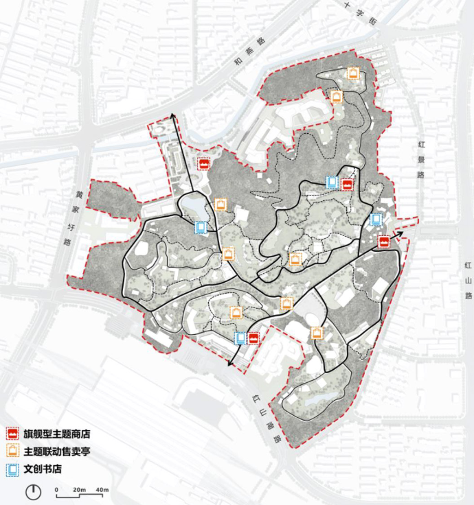 特色零售类设施中,旗舰型主题商店设置在园区主入口区,游客入/离园的高频购买区。在明星动物展区附近,设置主题联动售卖店设置。而文创书店则设置在教育区/科普馆出口,以科普衍生品、图书为主。