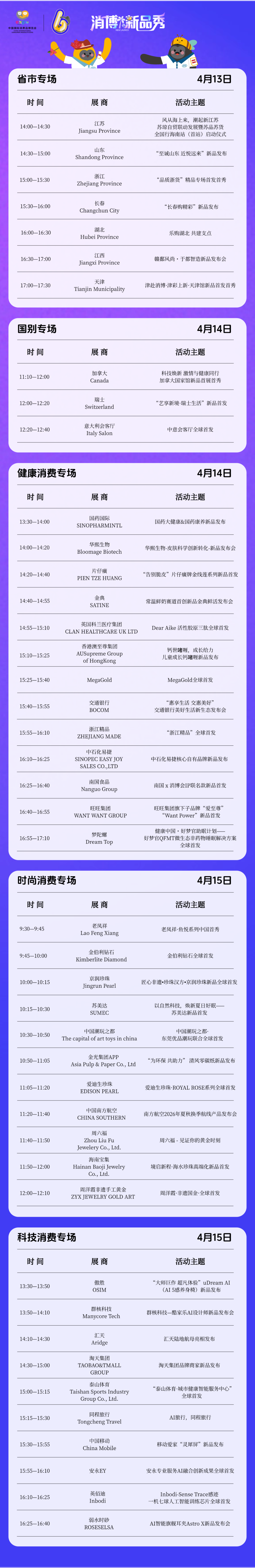 在省市专场,江苏、山东、浙江、吉林长春、湖北、江西、天津组团将一一亮相,国货潮品集中上新。在国别专场,加拿大、瑞士、意大利将推出新品首发首秀活动。在健康消费专场,国药国际、华熙生物、片仔癀、MegaGold、金典、旺旺等将举办新品全球首发等活动。在时尚消费专场,老凤祥、金伯利、京润珍珠、爱迪生珍珠、周六福等将齐聚亮相。在科技消费专场,傲胜、群核科技、汇天、淘天集团、中国移动、同程旅行等将带来AI与智能生活的创新成果。