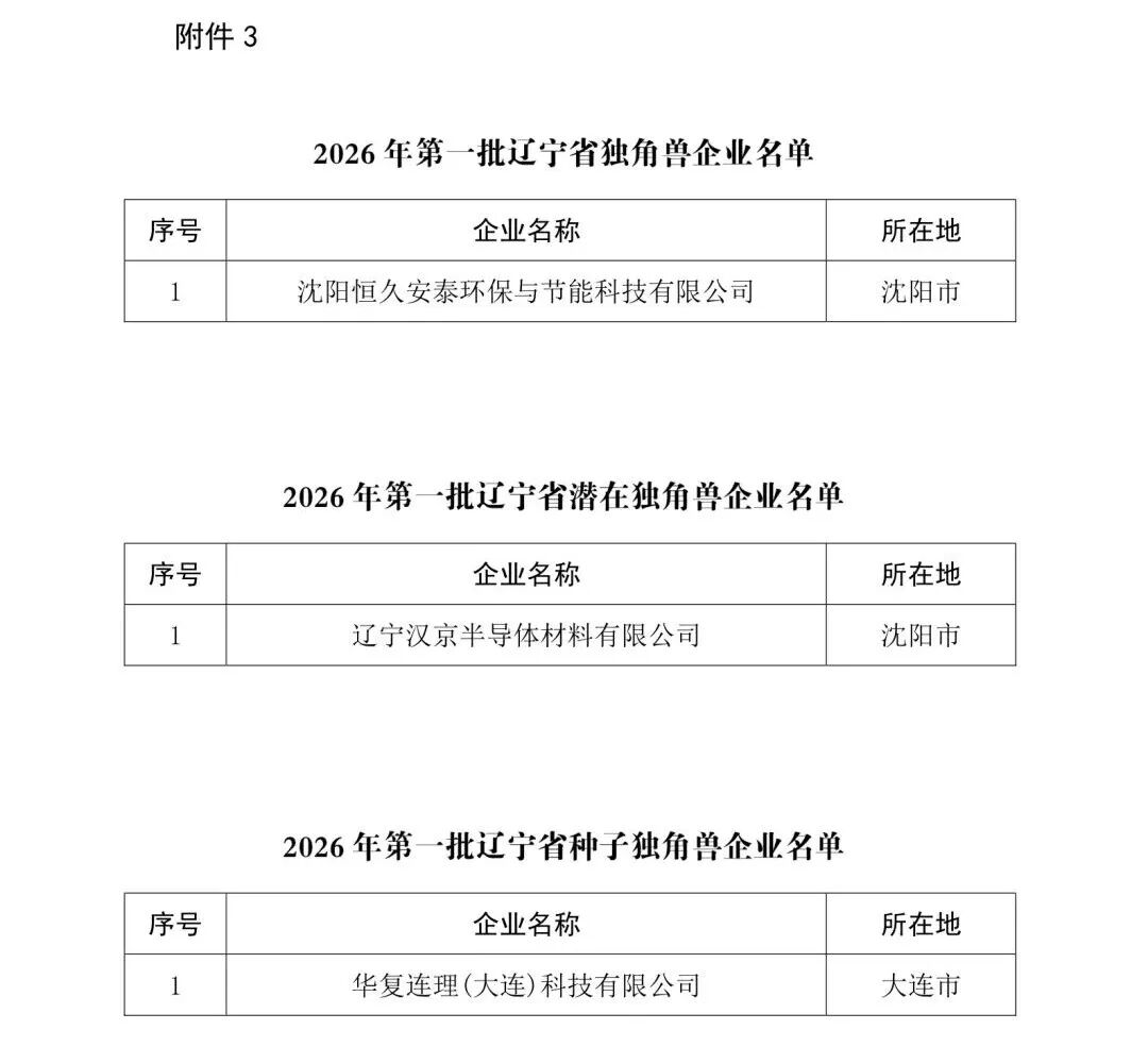 根据《辽宁省雏鹰、瞪羚、独角兽企业评价办法(试行)》(辽科创办发〔2021〕2号),省科技厅组织了2026年度第一批辽宁省雏鹰瞪羚独角兽企业备案工作,现将科睿(辽宁)医疗器械有限公司等211家备案的雏鹰企业、国机传感科技有限公司等41家备案的瞪羚企业、沈阳恒久安泰环保与节能科技有限公司备案的独角兽企业、辽宁汉京半导体材料有限公司备案的潜在独角兽企业、华复连理(大连)科技有限公司备案的种子独角兽名单予以公布。
