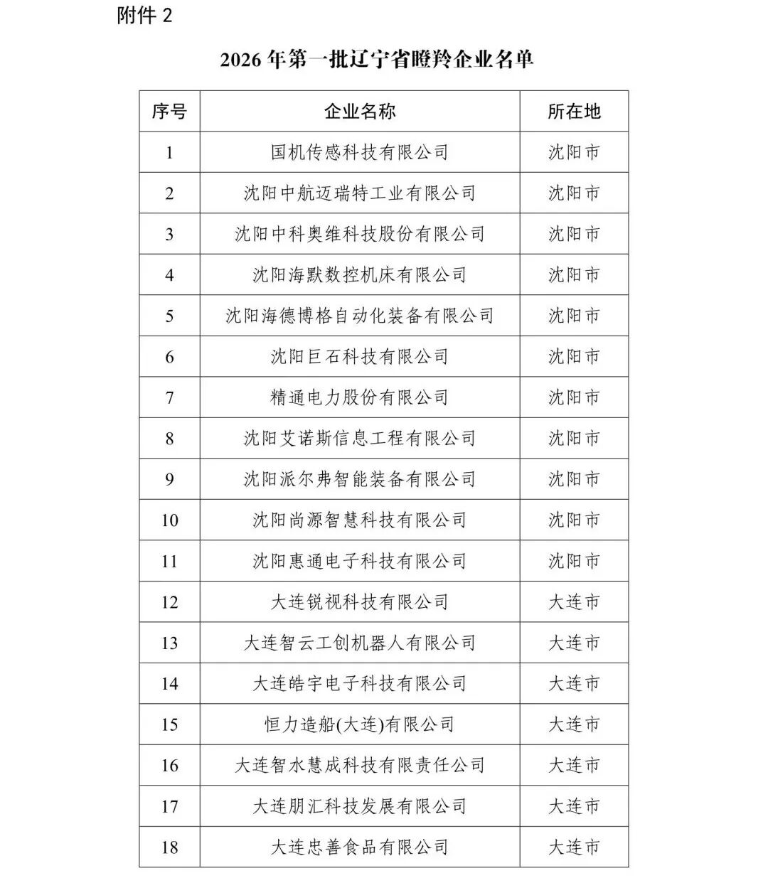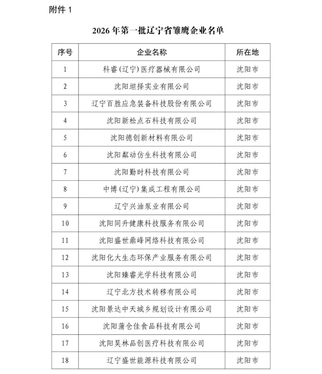 2026年第一批辽宁省雏鹰瞪羚独角兽企业名单