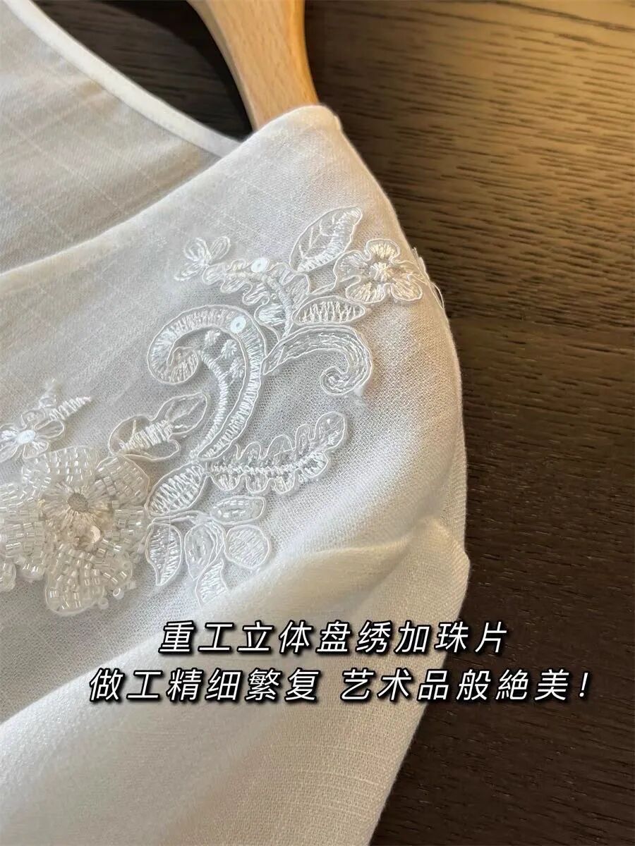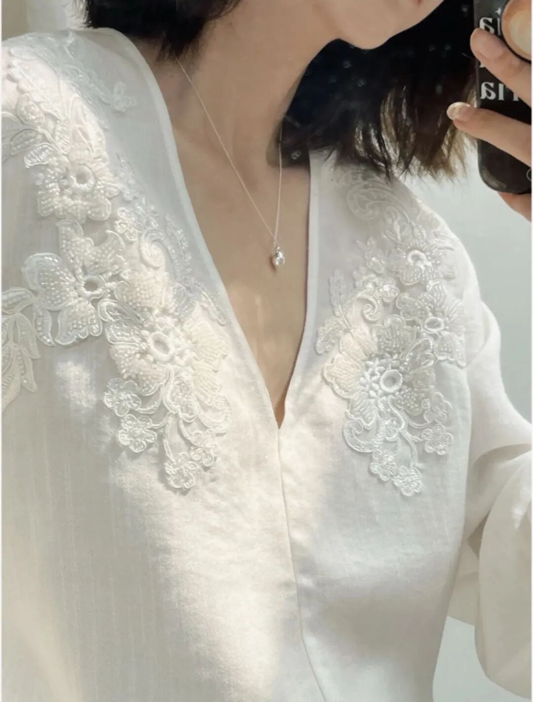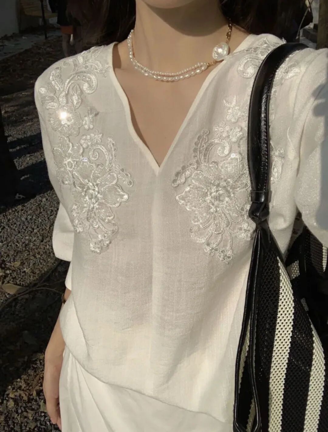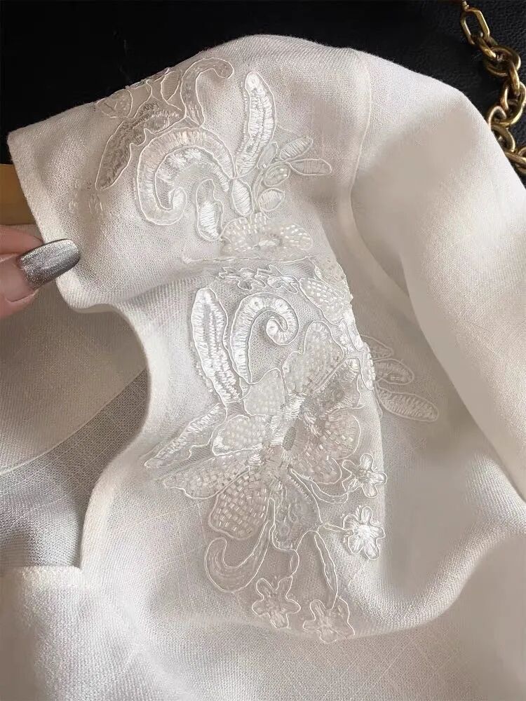好是好,不便宜,想着给大家推荐,火速联系合作很久的供应商伊泺杉,打磨出来这一件—— 法式刺绣仿苎麻V领上衣。