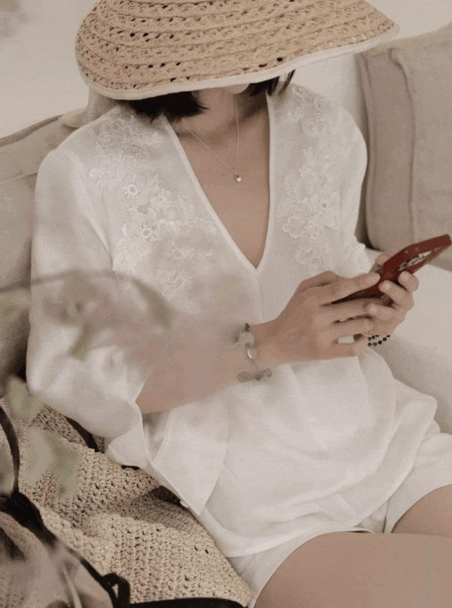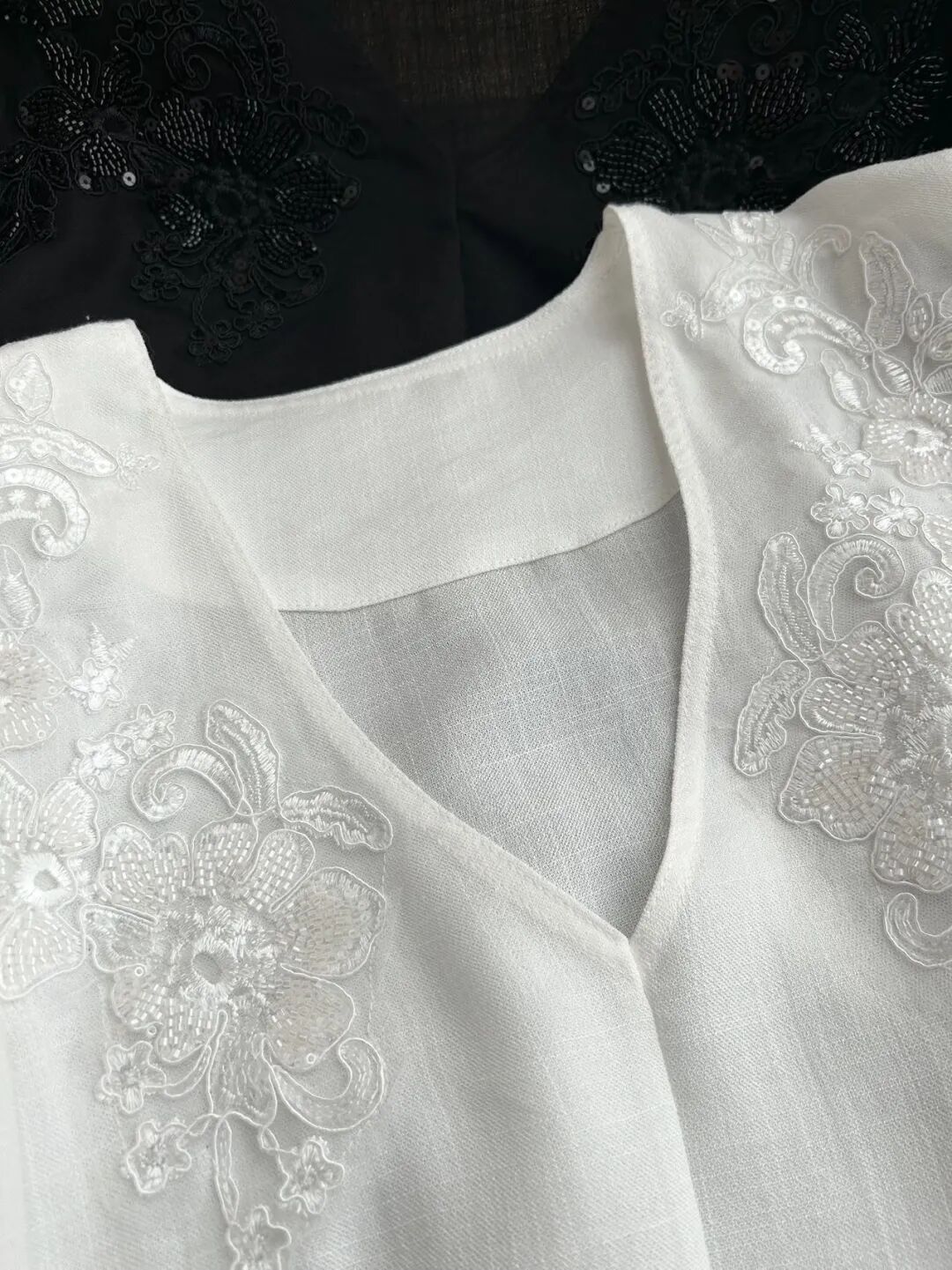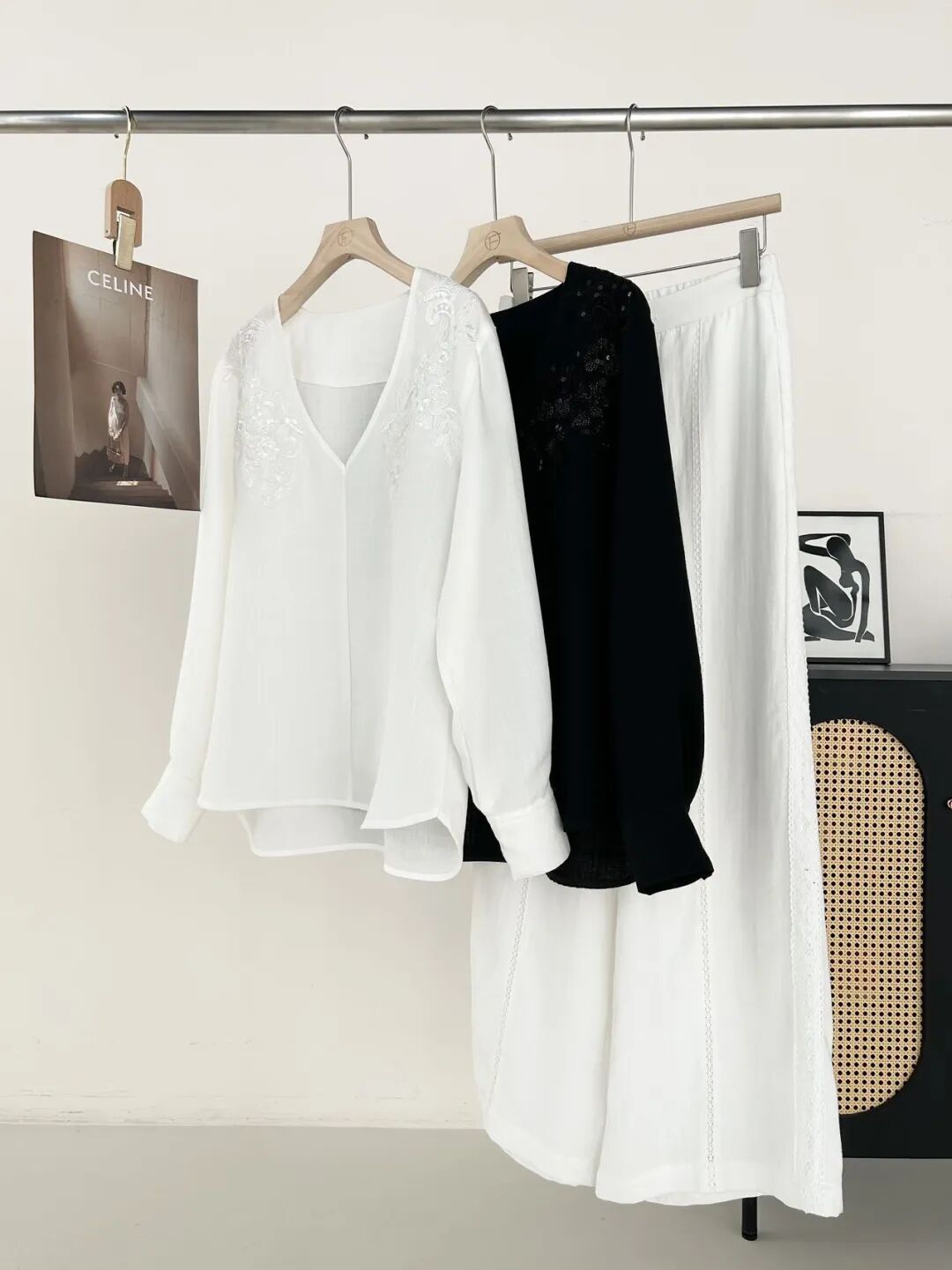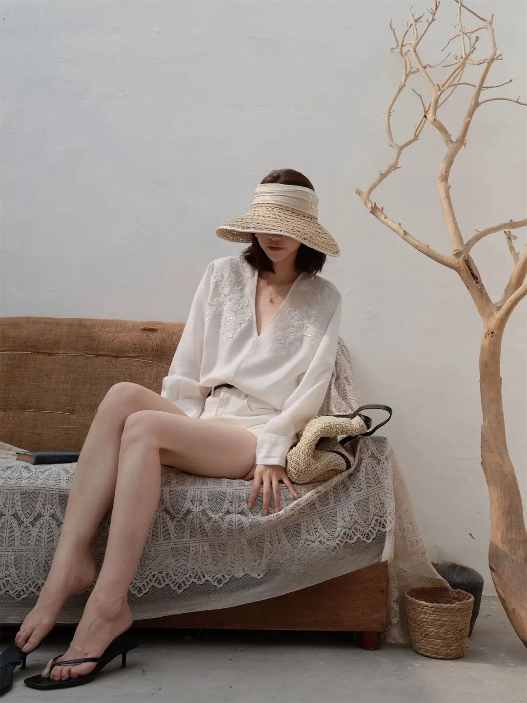 好是好,不便宜,想着给大家推荐,火速联系合作很久的供应商伊泺杉,打磨出来这一件—— 法式刺绣仿苎麻V领上衣。