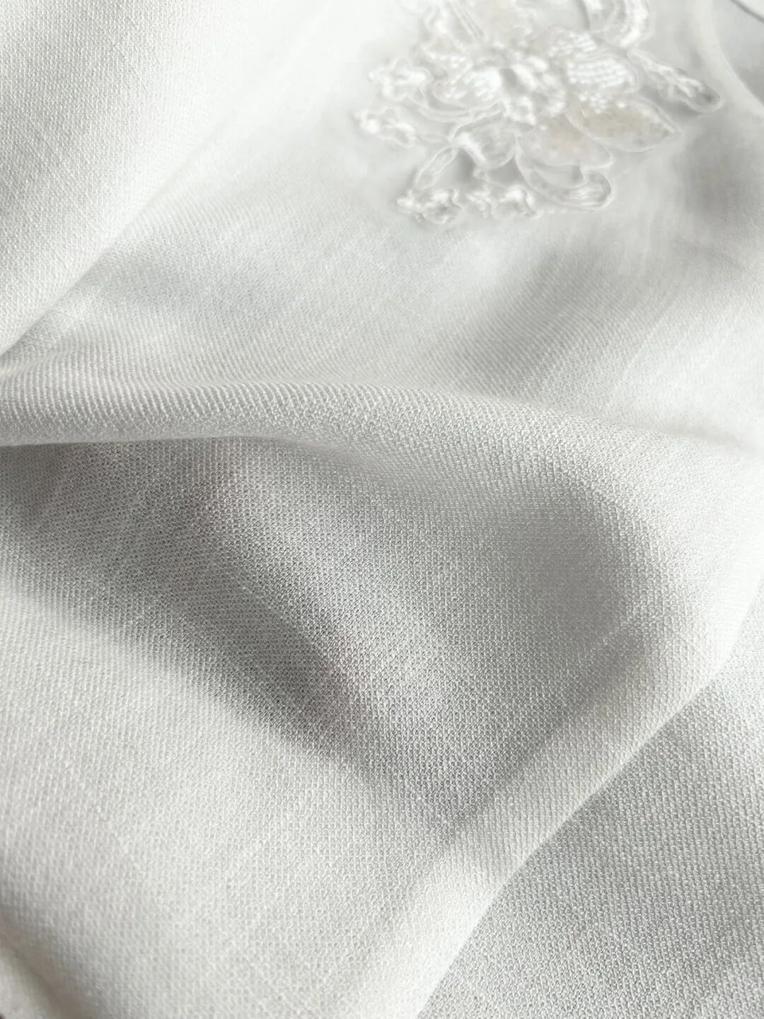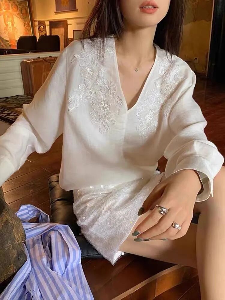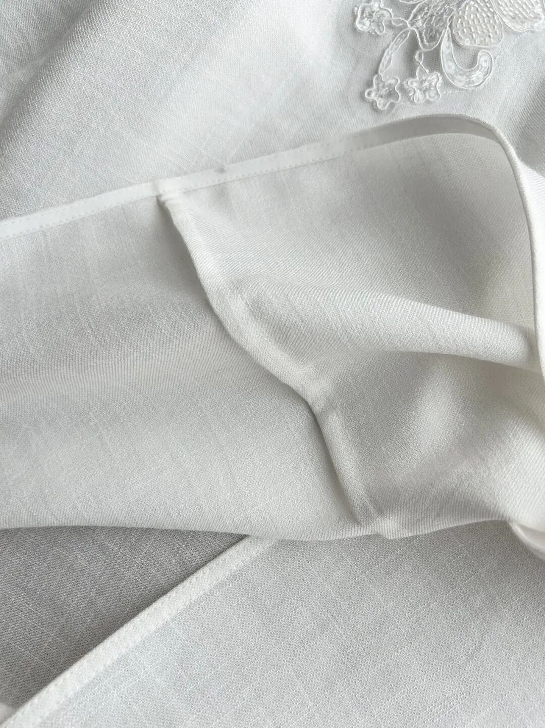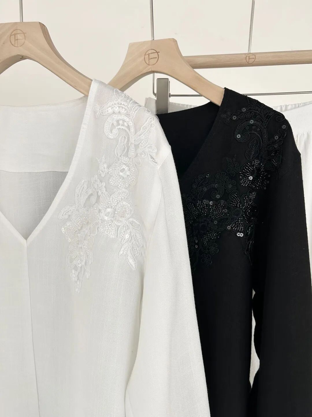 好是好,不便宜,想着给大家推荐,火速联系合作很久的供应商伊泺杉,打磨出来这一件—— 法式刺绣仿苎麻V领上衣。