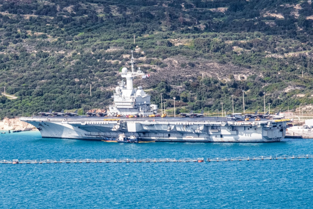 当地时间4月3日,法国“戴高乐”号航母驶入希腊苏达湾海军基地,预计将停靠至4月7日。