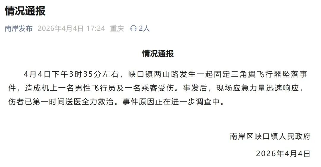4月4日下午3时35分左右,峡口镇两山路发生一起固定三角翼飞行器坠落事件,造成机上一名男性飞行员及一名乘客受伤。事发后,现场应急力量迅速响应,伤者已第一时间送医全力救治。事件原因正在进一步调查中。