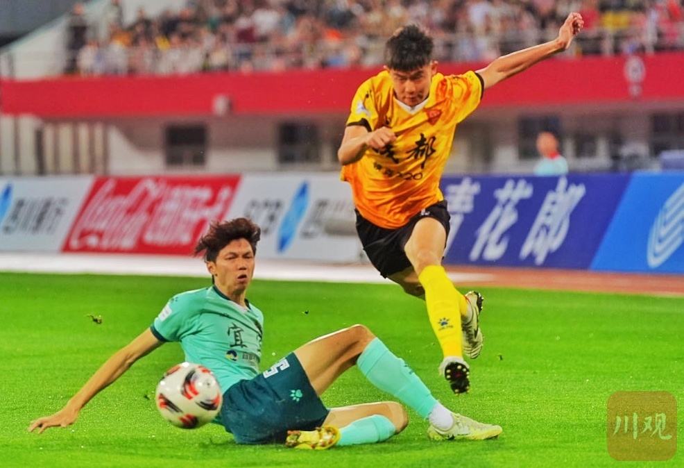 宜宾长江首城队员铲球阻击成都锦城队进攻。