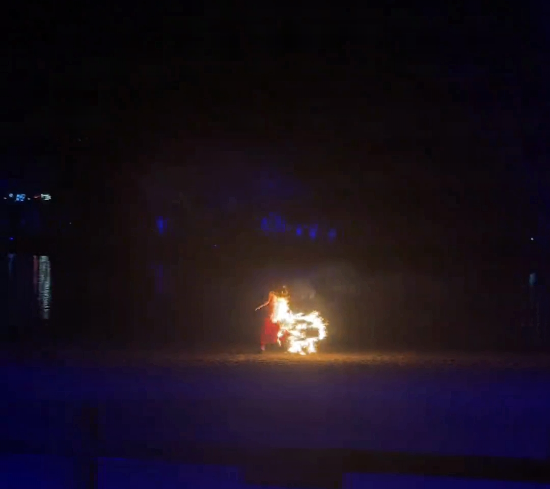 游客拍摄的视频显示,一名身穿红色连体长裙的女子半蹲在火圈内,长裙下摆沿火圈铺开,两名男子手持火把将地上的火圈点燃后离开,女子舞动着双手,十多秒后,她站起身来,双手提起裙摆开始转圈,不料裙子被火圈引燃,随后只见女子开始往表演场地后方的水池子快速跑去,其间女子后背的火势渐大,奔跑11秒后,女子跳进水池中,火势消灭。