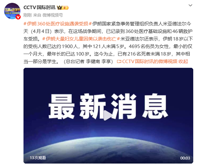伊朗国家紧急事务管理组织负责人米亚德法尔今天(4月4日)表示,在这场战争期间,已记录到360处医疗基础设施和46辆救护车受损。