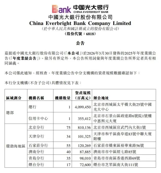 4月1日晚,光大银行在港交所发布公告,对分支机构的资产规模数进行了确认。从公告发布数据来看,光大银行对之前在港交所披露的数据进行了变更,变更后的数据与上交所发布的2025年年报数据保持一致。