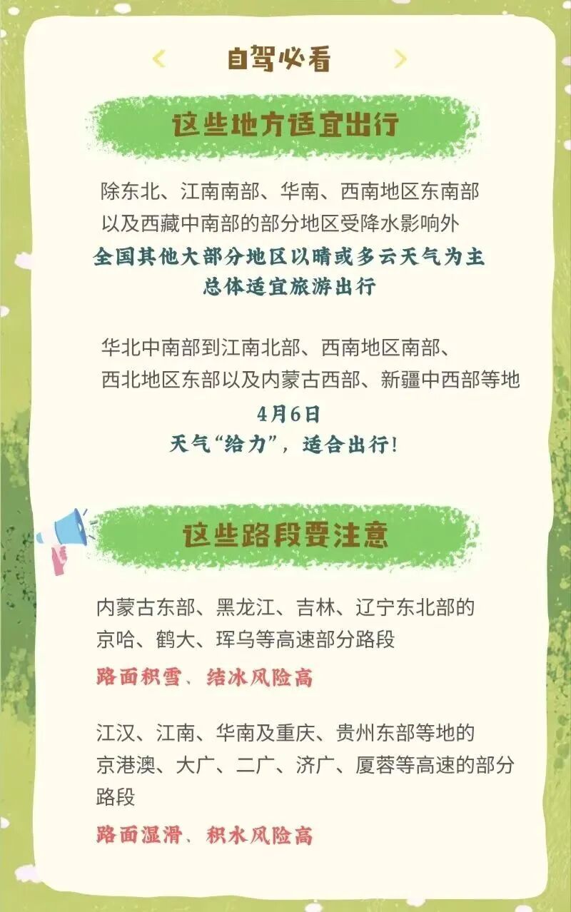 气象专家提醒,清明节假期期间,北方部分地区风力较大,公众要注意户外用火安全,文明祭祀。受大风传输作用,北方部分地区会出现沙尘天气,公众外出需做好防护。南方地区降水较多,部分地区降雨量较大,尽量远离山区、河谷、地势低洼等危险区域,注意出行安全。