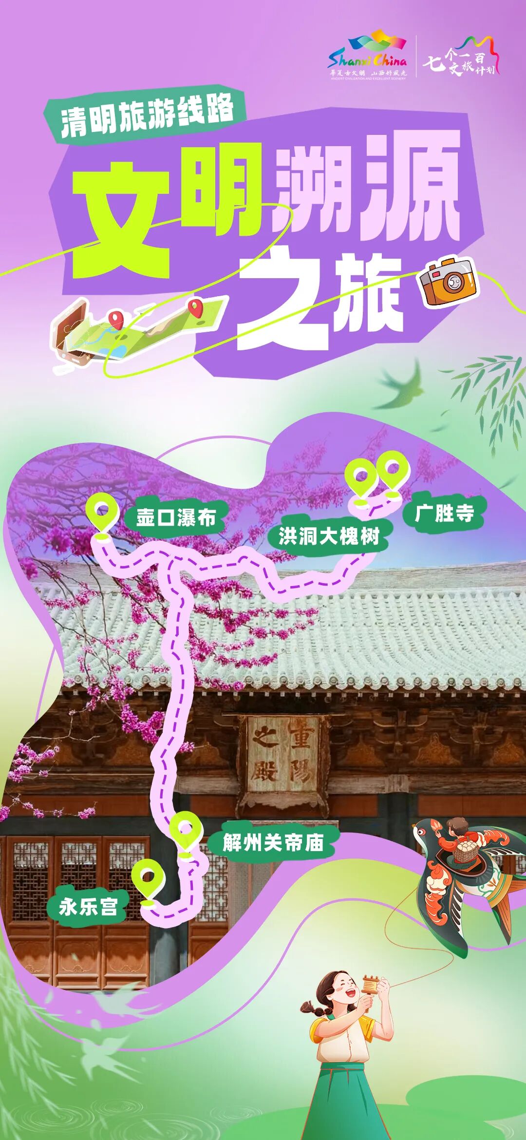 走进运城、临汾,沿着黄河根祖文化脉络探寻华夏文明之源,串联永乐宫、关帝庙博物馆、山西黄河壶口瀑布旅游区、洪洞大槐树、广胜寺等标志性景点,引导游客在旅程中读懂黄河文化的厚重与博大,探寻华夏文明的源头脉络。
